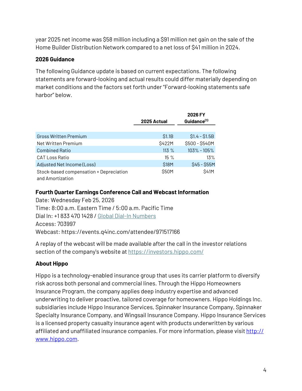 year 2025 net income was $58 million including a $91 million net gain on the sale of the Home Builder Distribution Network compared to a net loss of $41 million in 2024. 2026 Guidance The following Guidance update is based on current expectations. The following statements are forward-looking and actual results could differ materially depending on market conditions and the factors set forth under “Forward-looking statements safe harbor” below. 2025 Actual 2026 FY Guidance(1) Gross Written Premium $1.1B $1.4 - $1.5B Net Written Premium $422M $500 - $540M Combined Ratio 113 % 103% - 105% CAT Loss Ratio 15 % 13% Adjusted Net Income (Loss) $18M $45 - $55M Stock-based compensation + Depreciation and Amortization $50M $41M Fourth Quarter Earnings Conference Call and Webcast Information Date: Wednesday Feb 25, 2026 Time: 8:00 a.m. Eastern Time / 5:00 a.m. Pacific Time Dial In: +1 833 470 1428 / Global Dial-In Numbers Access: 703997 Webcast: https://events.q4inc.com/attendee/971517166 A replay of the webcast will be made available after the call in the investor relations section of the company's website at https://investors.hippo.com/ About Hippo Hippo is a technology-enabled insurance group that uses its carrier platform to diversify risk across both personal and commercial lines. Through the Hippo Homeowners Insurance Program, the company applies deep industry expertise and advanced underwriting to deliver proactive, tailored coverage for homeowners. Hippo Holdings Inc. subsidiaries include Hippo Insurance Services, Spinnaker Insurance Company, Spinnaker Specialty Insurance Company, and Wingsail Insurance Company. Hippo Insurance Services is a licensed property casualty insurance agent with products underwritten by various affiliated and unaffiliated insurance companies. For more information, please visit http:// www.hippo.com. 4