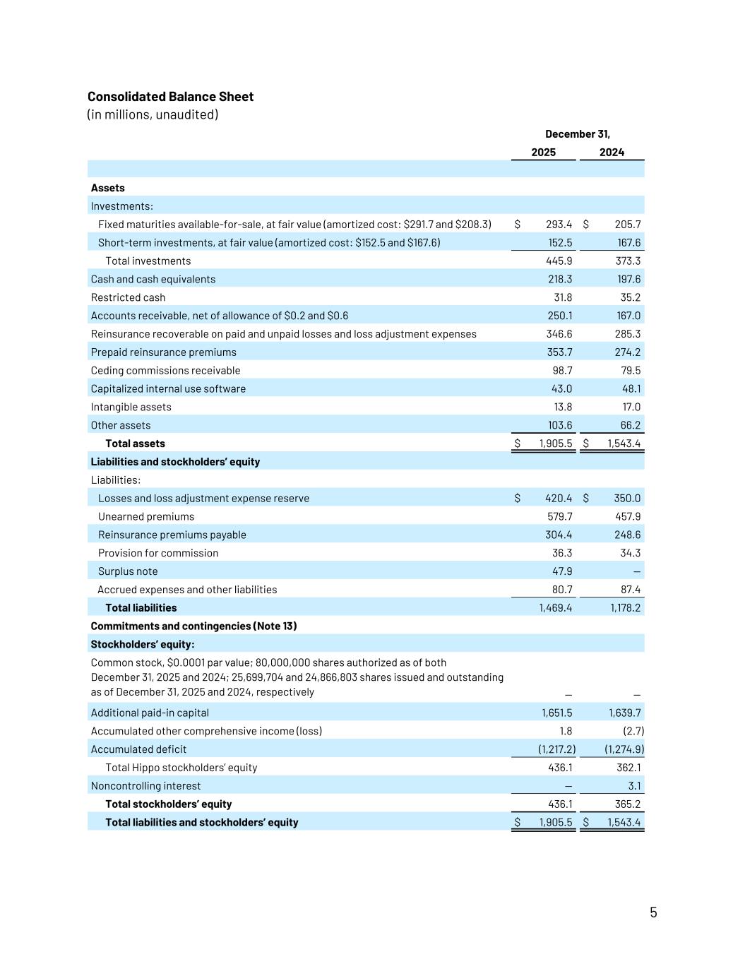 Consolidated Balance Sheet (in millions, unaudited) December 31, 2025 2024 Assets Investments: Fixed maturities available-for-sale, at fair value (amortized cost: $291.7 and $208.3) $ 293.4 $ 205.7 Short-term investments, at fair value (amortized cost: $152.5 and $167.6) 152.5 167.6 Total investments 445.9 373.3 Cash and cash equivalents 218.3 197.6 Restricted cash 31.8 35.2 Accounts receivable, net of allowance of $0.2 and $0.6 250.1 167.0 Reinsurance recoverable on paid and unpaid losses and loss adjustment expenses 346.6 285.3 Prepaid reinsurance premiums 353.7 274.2 Ceding commissions receivable 98.7 79.5 Capitalized internal use software 43.0 48.1 Intangible assets 13.8 17.0 Other assets 103.6 66.2 Total assets $ 1,905.5 $ 1,543.4 Liabilities and stockholders’ equity Liabilities: Losses and loss adjustment expense reserve $ 420.4 $ 350.0 Unearned premiums 579.7 457.9 Reinsurance premiums payable 304.4 248.6 Provision for commission 36.3 34.3 Surplus note 47.9 — Accrued expenses and other liabilities 80.7 87.4 Total liabilities 1,469.4 1,178.2 Commitments and contingencies (Note 13) Stockholders’ equity: Common stock, $0.0001 par value; 80,000,000 shares authorized as of both December 31, 2025 and 2024; 25,699,704 and 24,866,803 shares issued and outstanding as of December 31, 2025 and 2024, respectively — — Additional paid-in capital 1,651.5 1,639.7 Accumulated other comprehensive income (loss) 1.8 (2.7) Accumulated deficit (1,217.2) (1,274.9) Total Hippo stockholders’ equity 436.1 362.1 Noncontrolling interest — 3.1 Total stockholders’ equity 436.1 365.2 Total liabilities and stockholders’ equity $ 1,905.5 $ 1,543.4 5