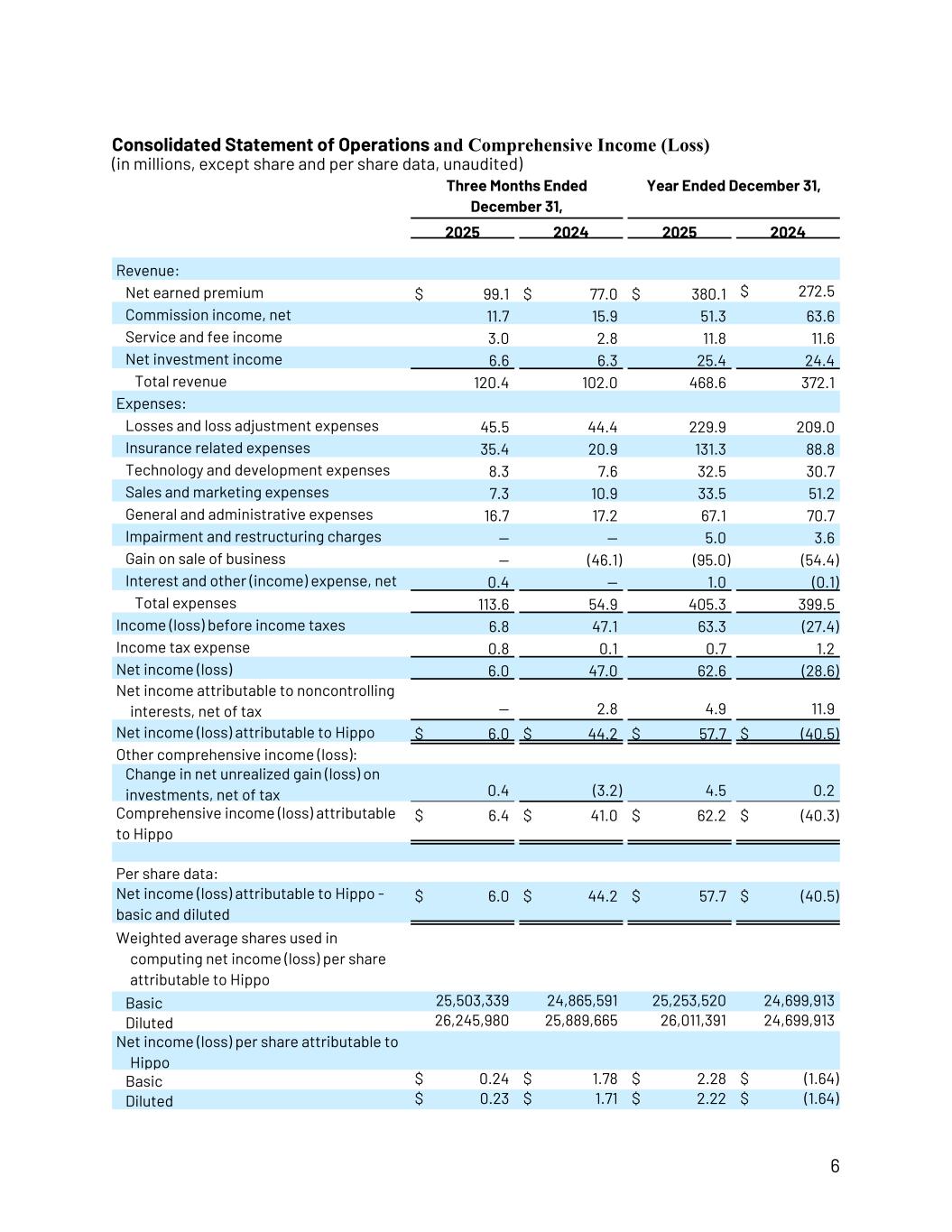 Consolidated Statement of Operations and Comprehensive Income (Loss) (in millions, except share and per share data, unaudited) Three Months Ended December 31, Year Ended December 31, 2025 2024 2025 2024 Revenue: Net earned premium $ 99.1 $ 77.0 $ 380.1 $ 272.5 Commission income, net 11.7 15.9 51.3 63.6 Service and fee income 3.0 2.8 11.8 11.6 Net investment income 6.6 6.3 25.4 24.4 Total revenue 120.4 102.0 468.6 372.1 Expenses: Losses and loss adjustment expenses 45.5 44.4 229.9 209.0 Insurance related expenses 35.4 20.9 131.3 88.8 Technology and development expenses 8.3 7.6 32.5 30.7 Sales and marketing expenses 7.3 10.9 33.5 51.2 General and administrative expenses 16.7 17.2 67.1 70.7 Impairment and restructuring charges — — 5.0 3.6 Gain on sale of business — (46.1) (95.0) (54.4) Interest and other (income) expense, net 0.4 — 1.0 (0.1) Total expenses 113.6 54.9 405.3 399.5 Income (loss) before income taxes 6.8 47.1 63.3 (27.4) Income tax expense 0.8 0.1 0.7 1.2 Net income (loss) 6.0 47.0 62.6 (28.6) Net income attributable to noncontrolling interests, net of tax — 2.8 4.9 11.9 Net income (loss) attributable to Hippo $ 6.0 $ 44.2 $ 57.7 $ (40.5) Other comprehensive income (loss): Change in net unrealized gain (loss) on investments, net of tax 0.4 (3.2) 4.5 0.2 Comprehensive income (loss) attributable to Hippo $ 6.4 $ 41.0 $ 62.2 $ (40.3) Per share data: Net income (loss) attributable to Hippo - basic and diluted $ 6.0 $ 44.2 $ 57.7 $ (40.5) Weighted average shares used in computing net income (loss) per share attributable to Hippo Basic 25,503,339 24,865,591 25,253,520 24,699,913 Diluted 26,245,980 25,889,665 26,011,391 24,699,913 Net income (loss) per share attributable to Hippo Basic $ 0.24 $ 1.78 $ 2.28 $ (1.64) Diluted $ 0.23 $ 1.71 $ 2.22 $ (1.64) 6