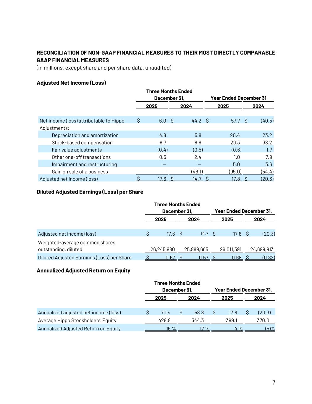 RECONCILIATION OF NON-GAAP FINANCIAL MEASURES TO THEIR MOST DIRECTLY COMPARABLE GAAP FINANCIAL MEASURES (in millions, except share and per share data, unaudited) Adjusted Net Income (Loss) Three Months Ended December 31, Year Ended December 31, 2025 2024 2025 2024 Net income (loss) attributable to Hippo $ 6.0 $ 44.2 $ 57.7 $ (40.5) Adjustments: Depreciation and amortization 4.8 5.8 20.4 23.2 Stock-based compensation 6.7 8.9 29.3 38.2 Fair value adjustments (0.4) (0.5) (0.6) 1.7 Other one-off transactions 0.5 2.4 1.0 7.9 Impairment and restructuring — — 5.0 3.6 Gain on sale of a business — (46.1) (95.0) (54.4) Adjusted net income (loss) $ 17.6 $ 14.7 $ 17.8 $ (20.3) Diluted Adjusted Earnings (Loss) per Share Three Months Ended December 31, Year Ended December 31, 2025 2024 2025 2024 Adjusted net income (loss) $ 17.6 $ 14.7 $ 17.8 $ (20.3) Weighted-average common shares outstanding, diluted 26,245,980 25,889,665 26,011,391 24,699,913 Diluted Adjusted Earnings (Loss) per Share $ 0.67 $ 0.57 $ 0.68 $ (0.82) Annualized Adjusted Return on Equity Three Months Ended December 31, Year Ended December 31, 2025 2024 2025 2024 Annualized adjusted net income (loss) $ 70.4 $ 58.8 $ 17.8 $ (20.3) Average Hippo Stockholders' Equity 428.8 344.3 399.1 370.0 Annualized Adjusted Return on Equity 16 % 17 % 4 % (5) % 7