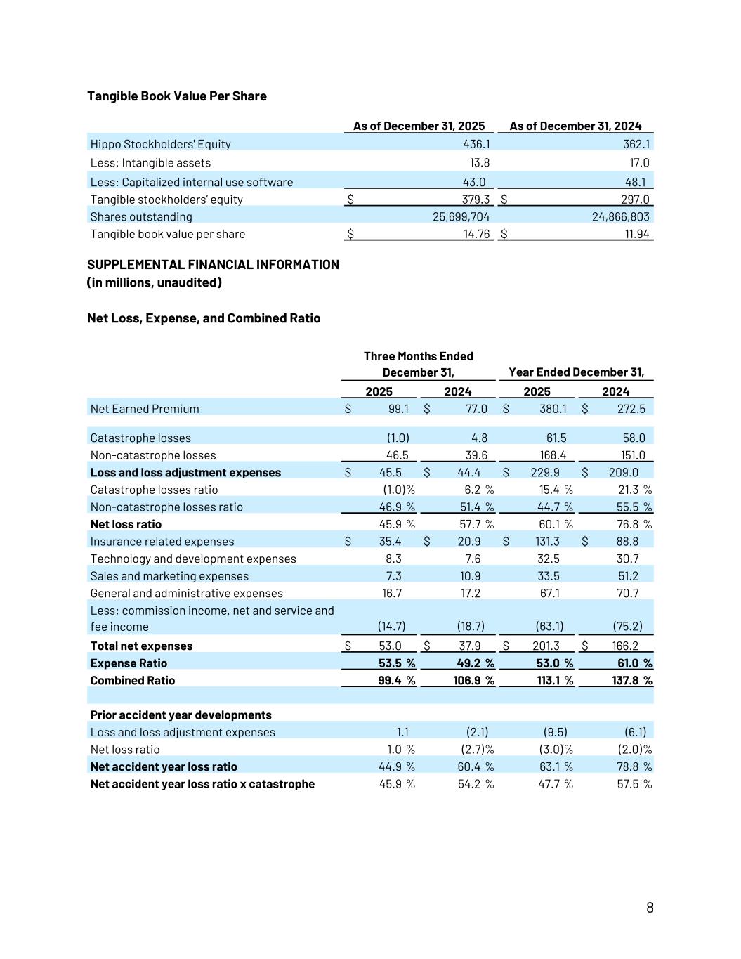 Tangible Book Value Per Share As of December 31, 2025 As of December 31, 2024 Hippo Stockholders' Equity 436.1 362.1 Less: Intangible assets 13.8 17.0 Less: Capitalized internal use software 43.0 48.1 Tangible stockholders’ equity $ 379.3 $ 297.0 Shares outstanding 25,699,704 24,866,803 Tangible book value per share $ 14.76 $ 11.94 SUPPLEMENTAL FINANCIAL INFORMATION (in millions, unaudited) Net Loss, Expense, and Combined Ratio Three Months Ended December 31, Year Ended December 31, 2025 2024 2025 2024 Net Earned Premium $ 99.1 $ 77.0 $ 380.1 $ 272.5 Catastrophe losses (1.0) 4.8 61.5 58.0 Non-catastrophe losses 46.5 39.6 168.4 151.0 Loss and loss adjustment expenses $ 45.5 $ 44.4 $ 229.9 $ 209.0 Catastrophe losses ratio (1.0) % 6.2 % 15.4 % 21.3 % Non-catastrophe losses ratio 46.9 % 51.4 % 44.7 % 55.5 % Net loss ratio 45.9 % 57.7 % 60.1 % 76.8 % Insurance related expenses $ 35.4 $ 20.9 $ 131.3 $ 88.8 Technology and development expenses 8.3 7.6 32.5 30.7 Sales and marketing expenses 7.3 10.9 33.5 51.2 General and administrative expenses 16.7 17.2 67.1 70.7 Less: commission income, net and service and fee income (14.7) (18.7) (63.1) (75.2) Total net expenses $ 53.0 $ 37.9 $ 201.3 $ 166.2 Expense Ratio 53.5 % 49.2 % 53.0 % 61.0 % Combined Ratio 99.4 % 106.9 % 113.1 % 137.8 % Prior accident year developments Loss and loss adjustment expenses 1.1 (2.1) (9.5) (6.1) Net loss ratio 1.0 % (2.7) % (3.0) % (2.0) % Net accident year loss ratio 44.9 % 60.4 % 63.1 % 78.8 % Net accident year loss ratio x catastrophe 45.9 % 54.2 % 47.7 % 57.5 % 8