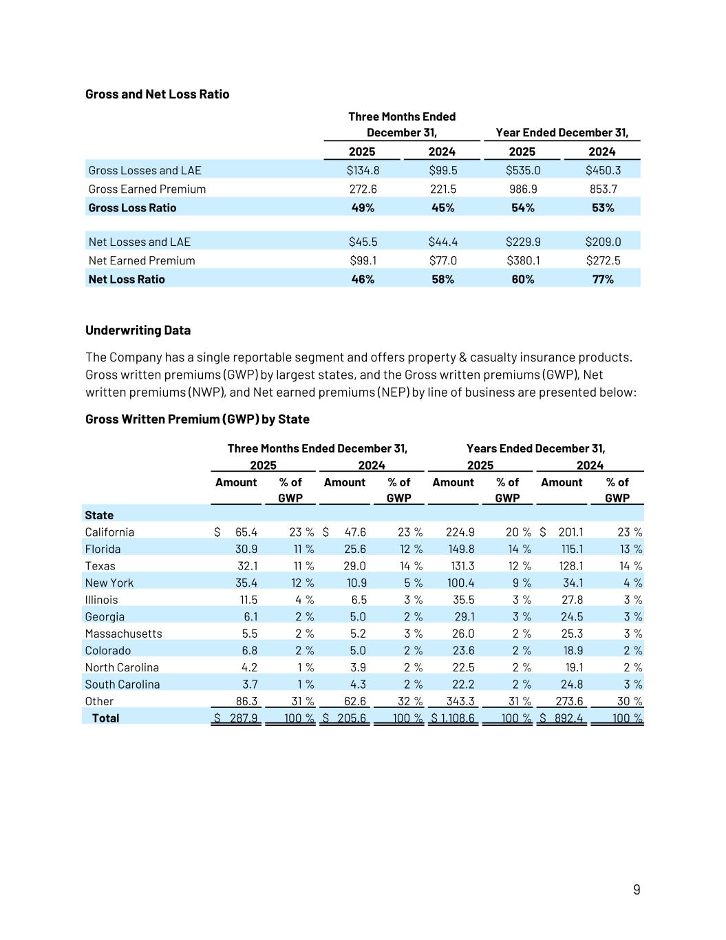 Gross and Net Loss Ratio Three Months Ended December 31, Year Ended December 31, 2025 2024 2025 2024 Gross Losses and LAE $134.8 $99.5 $535.0 $450.3 Gross Earned Premium 272.6 221.5 986.9 853.7 Gross Loss Ratio 49% 45% 54% 53% Net Losses and LAE $45.5 $44.4 $229.9 $209.0 Net Earned Premium $99.1 $77.0 $380.1 $272.5 Net Loss Ratio 46% 58% 60% 77% Underwriting Data The Company has a single reportable segment and offers property & casualty insurance products. Gross written premiums (GWP) by largest states, and the Gross written premiums (GWP), Net written premiums (NWP), and Net earned premiums (NEP) by line of business are presented below: Gross Written Premium (GWP) by State Three Months Ended December 31, Years Ended December 31, 2025 2024 2025 2024 Amount % of GWP Amount % of GWP Amount % of GWP Amount % of GWP State California $ 65.4 23 % $ 47.6 23 % 224.9 20 % $ 201.1 23 % Florida 30.9 11 % 25.6 12 % 149.8 14 % 115.1 13 % Texas 32.1 11 % 29.0 14 % 131.3 12 % 128.1 14 % New York 35.4 12 % 10.9 5 % 100.4 9 % 34.1 4 % Illinois 11.5 4 % 6.5 3 % 35.5 3 % 27.8 3 % Georgia 6.1 2 % 5.0 2 % 29.1 3 % 24.5 3 % Massachusetts 5.5 2 % 5.2 — 3 % 26.0 2 % 25.3 3 % Colorado 6.8 2 % 5.0 2 % 23.6 2 % 18.9 2 % North Carolina 4.2 1 % 3.9 2 % 22.5 2 % 19.1 2 % South Carolina 3.7 1 % 4.3 2 % 22.2 2 % 24.8 3 % Other 86.3 31 % 62.6 32 % 343.3 31 % 273.6 30 % Total $ 287.9 100 % $ 205.6 100 % $ 1,108.6 100 % $ 892.4 100 % 9