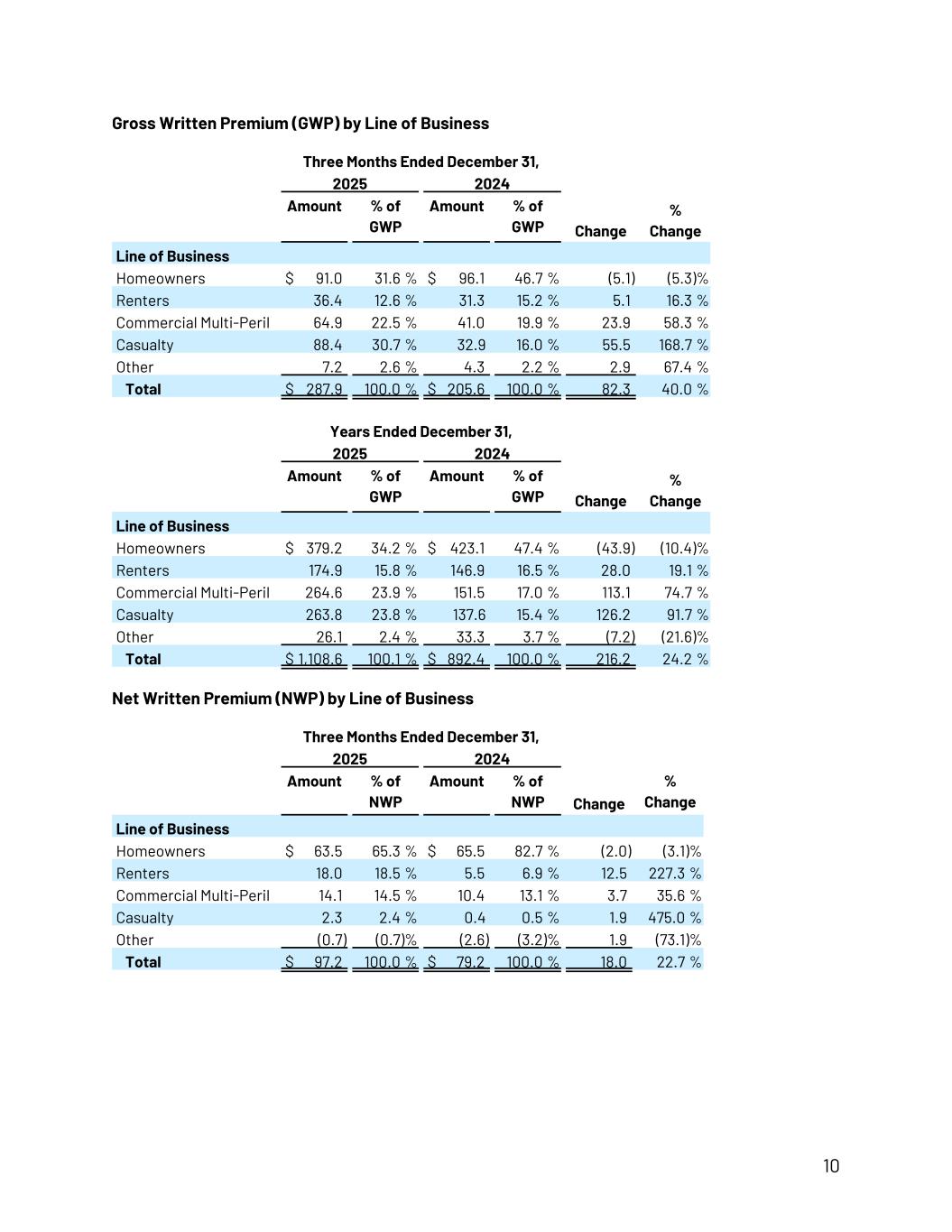 Gross Written Premium (GWP) by Line of Business Three Months Ended December 31, 2025 2024 Amount % of GWP Amount % of GWP Change % Change Line of Business Homeowners $ 91.0 31.6 % $ 96.1 46.7 % (5.1) (5.3) % Renters 36.4 12.6 % 31.3 15.2 % 5.1 16.3 % Commercial Multi-Peril 64.9 22.5 % 41.0 19.9 % 23.9 58.3 % Casualty 88.4 30.7 % 32.9 16.0 % 55.5 168.7 % Other 7.2 2.6 % 4.3 2.2 % 2.9 67.4 % Total $ 287.9 100.0 % $ 205.6 100.0 % 82.3 40.0 % Years Ended December 31, 2025 2024 Amount % of GWP Amount % of GWP Change % Change Line of Business Homeowners $ 379.2 34.2 % $ 423.1 47.4 % (43.9) (10.4) % Renters 174.9 15.8 % 146.9 16.5 % 28.0 19.1 % Commercial Multi-Peril 264.6 23.9 % 151.5 17.0 % 113.1 74.7 % Casualty 263.8 23.8 % 137.6 15.4 % 126.2 91.7 % Other 26.1 2.4 % 33.3 3.7 % (7.2) (21.6) % Total $ 1,108.6 100.1 % $ 892.4 100.0 % 216.2 24.2 % Net Written Premium (NWP) by Line of Business Three Months Ended December 31, 2025 2024 Amount % of NWP Amount % of NWP Change % Change Line of Business Homeowners $ 63.5 65.3 % $ 65.5 82.7 % (2.0) (3.1) % Renters 18.0 18.5 % 5.5 6.9 % 12.5 227.3 % Commercial Multi-Peril 14.1 14.5 % 10.4 13.1 % 3.7 35.6 % Casualty 2.3 2.4 % 0.4 0.5 % 1.9 475.0 % Other (0.7) (0.7) % (2.6) (3.2) % 1.9 (73.1) % Total $ 97.2 100.0 % $ 79.2 100.0 % 18.0 22.7 % 10