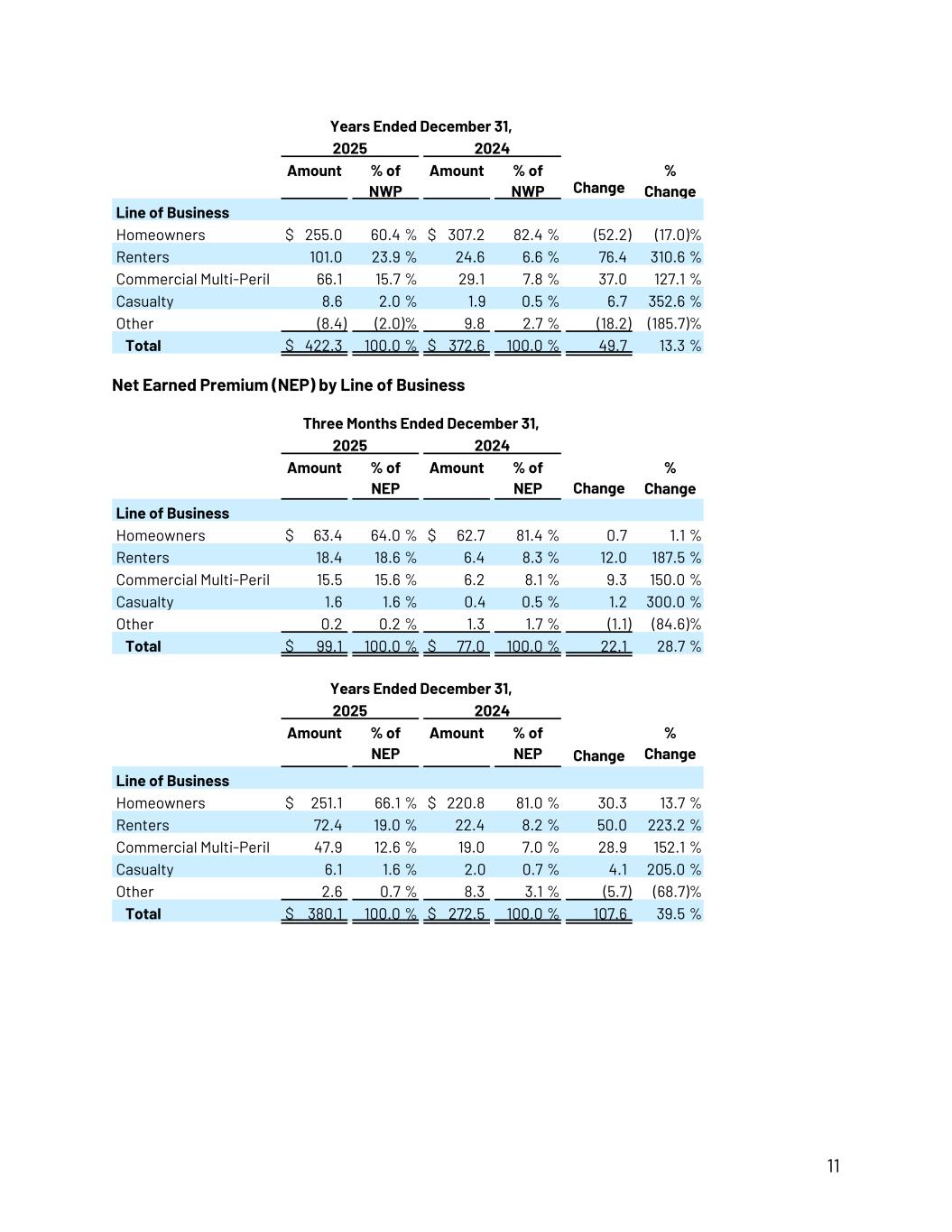 Years Ended December 31, 2025 2024 Amount % of NWP Amount % of NWP Change % Change Line of Business Homeowners $ 255.0 60.4 % $ 307.2 82.4 % (52.2) (17.0) % Renters 101.0 23.9 % 24.6 6.6 % 76.4 310.6 % Commercial Multi-Peril 66.1 15.7 % 29.1 7.8 % 37.0 127.1 % Casualty 8.6 2.0 % 1.9 0.5 % 6.7 352.6 % Other (8.4) (2.0) % 9.8 2.7 % (18.2) (185.7) % Total $ 422.3 100.0 % $ 372.6 100.0 % 49.7 13.3 % Net Earned Premium (NEP) by Line of Business Three Months Ended December 31, 2025 2024 Amount % of NEP Amount % of NEP Change % Change Line of Business Homeowners $ 63.4 64.0 % $ 62.7 81.4 % 0.7 1.1 % Renters 18.4 18.6 % 6.4 8.3 % 12.0 187.5 % Commercial Multi-Peril 15.5 15.6 % 6.2 8.1 % 9.3 150.0 % Casualty 1.6 1.6 % 0.4 0.5 % 1.2 300.0 % Other 0.2 0.2 % 1.3 1.7 % (1.1) (84.6) % Total $ 99.1 100.0 % $ 77.0 100.0 % 22.1 28.7 % Years Ended December 31, 2025 2024 Amount % of NEP Amount % of NEP Change % Change Line of Business Homeowners $ 251.1 66.1 % $ 220.8 81.0 % 30.3 13.7 % Renters 72.4 19.0 % 22.4 8.2 % 50.0 223.2 % Commercial Multi-Peril 47.9 12.6 % 19.0 7.0 % 28.9 152.1 % Casualty 6.1 1.6 % 2.0 0.7 % 4.1 205.0 % Other 2.6 0.7 % 8.3 3.1 % (5.7) (68.7) % Total $ 380.1 100.0 % $ 272.5 100.0 % 107.6 39.5 % 11