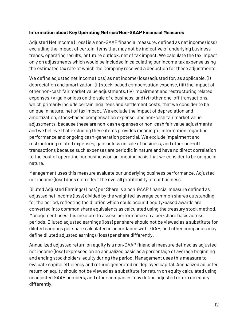 Information about Key Operating Metrics/Non-GAAP Financial Measures Adjusted Net Income (Loss) is a non-GAAP financial measure, defined as net income (loss) excluding the impact of certain items that may not be indicative of underlying business trends, operating results, or future outlook, net of tax impact. We calculate the tax impact only on adjustments which would be included in calculating our income tax expense using the estimated tax rate at which the Company received a deduction for these adjustments. We define adjusted net income (loss) as net income (loss) adjusted for, as applicable, (i) depreciation and amortization, (ii) stock-based compensation expense, (iii) the impact of other non-cash fair market value adjustments, (iv) impairment and restructuring related expenses, (v) gain or loss on the sale of a business, and (vi) other one-off transactions, which primarily include certain legal fees and settlement costs, that we consider to be unique in nature, net of tax impact. We exclude the impact of depreciation and amortization, stock-based compensation expense, and non-cash fair market value adjustments, because these are non-cash expenses or non-cash fair value adjustments and we believe that excluding these items provides meaningful information regarding performance and ongoing cash-generation potential. We exclude impairment and restructuring related expenses, gain or loss on sale of business, and other one-off transactions because such expenses are periodic in nature and have no direct correlation to the cost of operating our business on an ongoing basis that we consider to be unique in nature. Management uses this measure evaluate our underlying business performance. Adjusted net income (loss) does not reflect the overall profitability of our business. Diluted Adjusted Earnings (Loss) per Share is a non-GAAP financial measure defined as adjusted net income (loss) divided by the weighted-average common shares outstanding for the period, reflecting the dilution which could occur if equity-based awards are converted into common share equivalents as calculated using the treasury stock method. Management uses this measure to assess performance on a per-share basis across periods. Diluted adjusted earnings (loss) per share should not be viewed as a substitute for diluted earnings per share calculated in accordance with GAAP, and other companies may define diluted adjusted earnings (loss) per share differently. Annualized adjusted return on equity is a non-GAAP financial measure defined as adjusted net income (loss) expressed on an annualized basis as a percentage of average beginning and ending stockholders’ equity during the period. Management uses this measure to evaluate capital efficiency and returns generated on deployed capital. Annualized adjusted return on equity should not be viewed as a substitute for return on equity calculated using unadjusted GAAP numbers, and other companies may define adjusted return on equity differently. 12