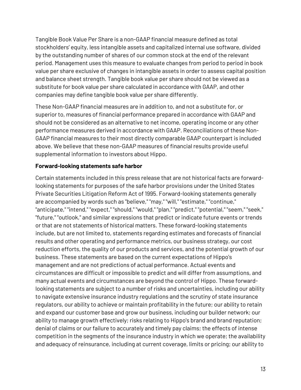 Tangible Book Value Per Share is a non-GAAP financial measure defined as total stockholders’ equity, less intangible assets and capitalized internal use software, divided by the outstanding number of shares of our common stock at the end of the relevant period. Management uses this measure to evaluate changes from period to period in book value per share exclusive of changes in intangible assets in order to assess capital position and balance sheet strength. Tangible book value per share should not be viewed as a substitute for book value per share calculated in accordance with GAAP, and other companies may define tangible book value per share differently. These Non-GAAP financial measures are in addition to, and not a substitute for, or superior to, measures of financial performance prepared in accordance with GAAP and should not be considered as an alternative to net income, operating income or any other performance measures derived in accordance with GAAP. Reconciliations of these Non- GAAP financial measures to their most directly comparable GAAP counterpart is included above. We believe that these non-GAAP measures of financial results provide useful supplemental information to investors about Hippo. Forward-looking statements safe harbor Certain statements included in this press release that are not historical facts are forward- looking statements for purposes of the safe harbor provisions under the United States Private Securities Litigation Reform Act of 1995. Forward-looking statements generally are accompanied by words such as "believe," "may," "will," "estimate," "continue," "anticipate," "intend," "expect," "should," "would," "plan," "predict," "potential," "seem," "seek," "future," "outlook," and similar expressions that predict or indicate future events or trends or that are not statements of historical matters. These forward-looking statements include, but are not limited to, statements regarding estimates and forecasts of financial results and other operating and performance metrics, our business strategy, our cost reduction efforts, the quality of our products and services, and the potential growth of our business. These statements are based on the current expectations of Hippo's management and are not predictions of actual performance. Actual events and circumstances are difficult or impossible to predict and will differ from assumptions, and many actual events and circumstances are beyond the control of Hippo. These forward- looking statements are subject to a number of risks and uncertainties, including our ability to navigate extensive insurance industry regulations and the scrutiny of state insurance regulators, our ability to achieve or maintain profitability in the future; our ability to retain and expand our customer base and grow our business, including our builder network; our ability to manage growth effectively; risks relating to Hippo's brand and brand reputation; denial of claims or our failure to accurately and timely pay claims; the effects of intense competition in the segments of the insurance industry in which we operate; the availability and adequacy of reinsurance, including at current coverage, limits or pricing; our ability to 13
