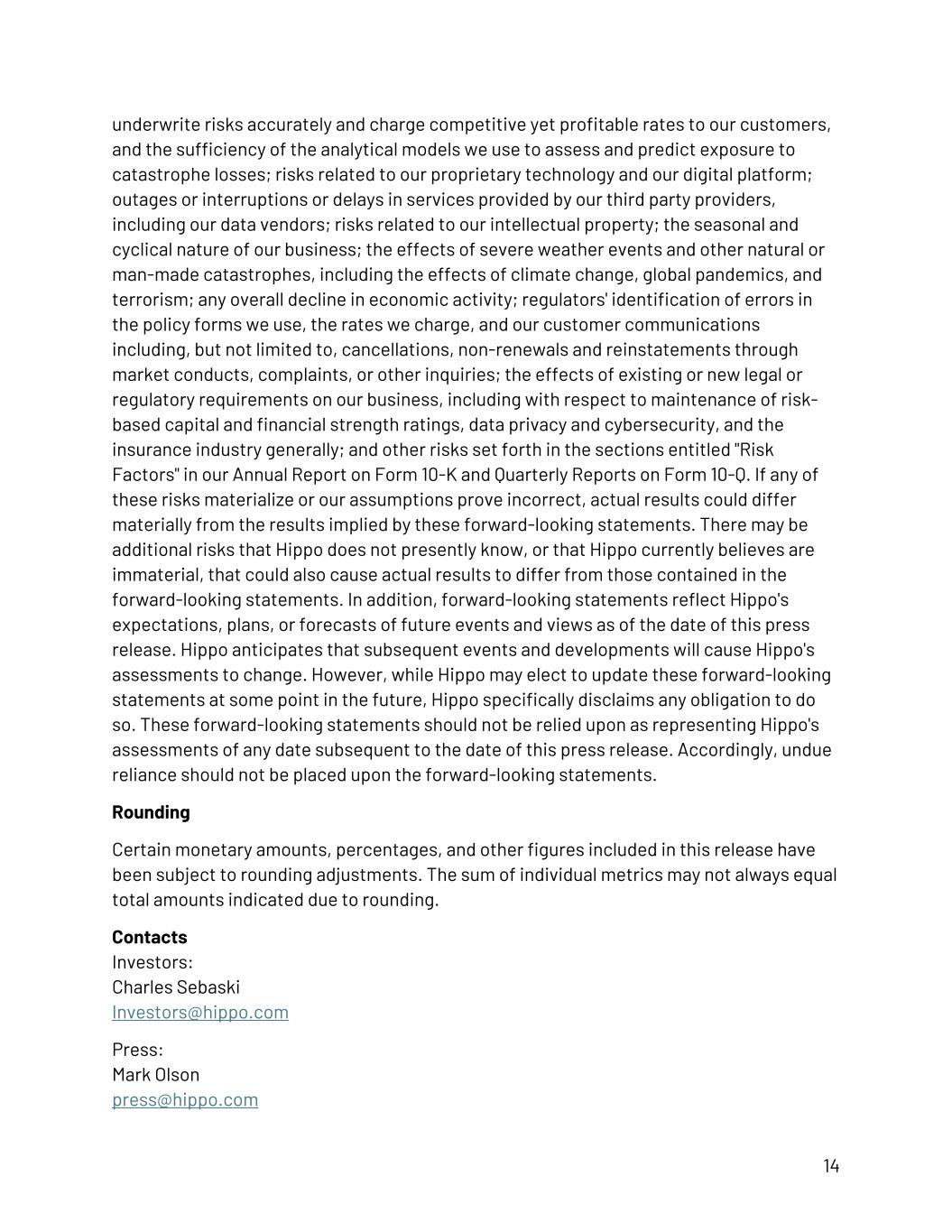 underwrite risks accurately and charge competitive yet profitable rates to our customers, and the sufficiency of the analytical models we use to assess and predict exposure to catastrophe losses; risks related to our proprietary technology and our digital platform; outages or interruptions or delays in services provided by our third party providers, including our data vendors; risks related to our intellectual property; the seasonal and cyclical nature of our business; the effects of severe weather events and other natural or man-made catastrophes, including the effects of climate change, global pandemics, and terrorism; any overall decline in economic activity; regulators' identification of errors in the policy forms we use, the rates we charge, and our customer communications including, but not limited to, cancellations, non-renewals and reinstatements through market conducts, complaints, or other inquiries; the effects of existing or new legal or regulatory requirements on our business, including with respect to maintenance of risk- based capital and financial strength ratings, data privacy and cybersecurity, and the insurance industry generally; and other risks set forth in the sections entitled "Risk Factors" in our Annual Report on Form 10-K and Quarterly Reports on Form 10-Q. If any of these risks materialize or our assumptions prove incorrect, actual results could differ materially from the results implied by these forward-looking statements. There may be additional risks that Hippo does not presently know, or that Hippo currently believes are immaterial, that could also cause actual results to differ from those contained in the forward-looking statements. In addition, forward-looking statements reflect Hippo's expectations, plans, or forecasts of future events and views as of the date of this press release. Hippo anticipates that subsequent events and developments will cause Hippo's assessments to change. However, while Hippo may elect to update these forward-looking statements at some point in the future, Hippo specifically disclaims any obligation to do so. These forward-looking statements should not be relied upon as representing Hippo's assessments of any date subsequent to the date of this press release. Accordingly, undue reliance should not be placed upon the forward-looking statements. Rounding Certain monetary amounts, percentages, and other figures included in this release have been subject to rounding adjustments. The sum of individual metrics may not always equal total amounts indicated due to rounding. Contacts Investors: Charles Sebaski Investors@hippo.com Press: Mark Olson press@hippo.com 14