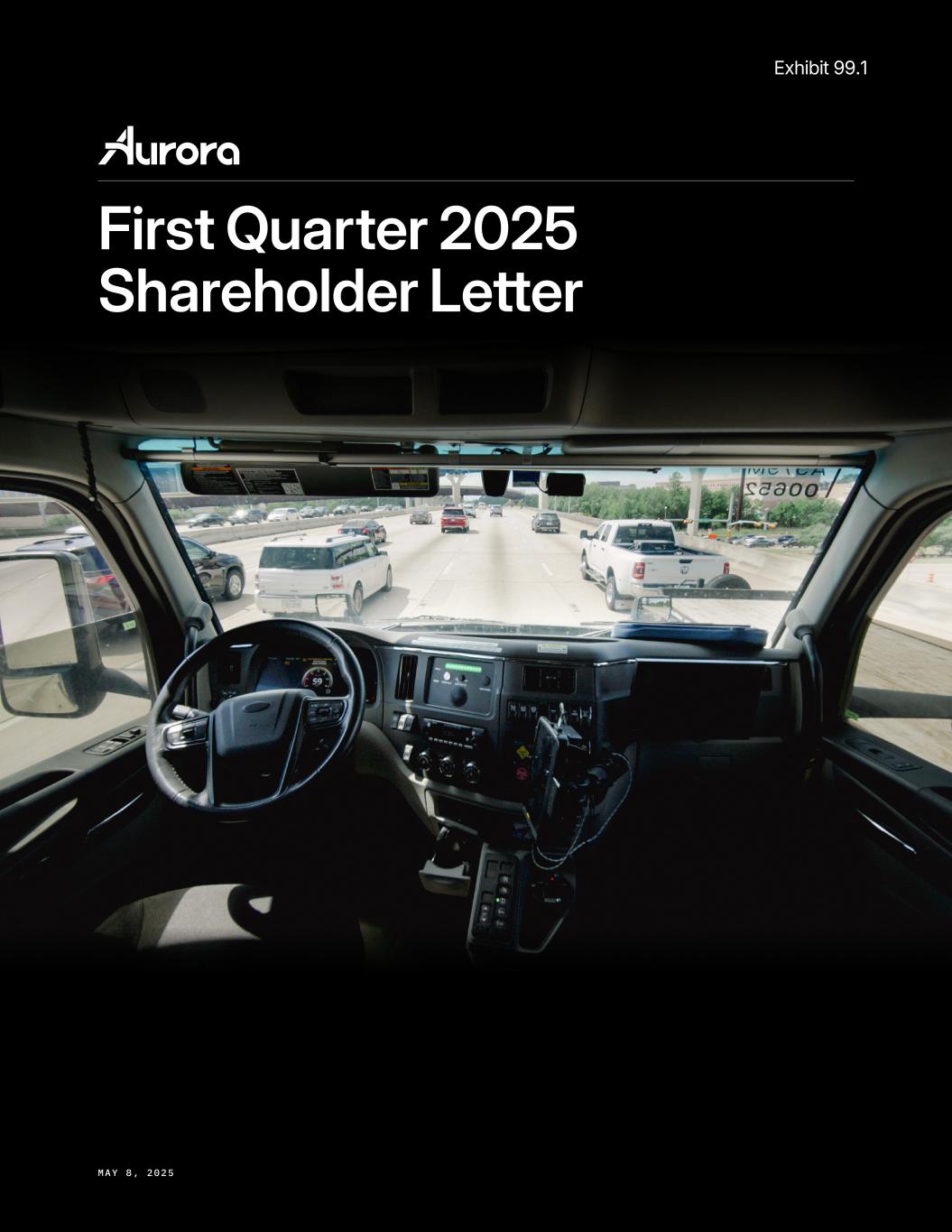 Cautionary statement regarding forward-looking statements This investor letter contains certain forward-looking statements within the meaning of the federal securities laws. The words “believe,” “may,” “will,” “estimate,” “continue,” “anticipate,” “intend,” “expect,” “could,” “would,” “project,” “plan,” “potential,” “indicative,” and similar expressions and variations thereof are intended to identify forward-looking statements, but are not the exclusive means of identifying such statements. All statements contained in this investor letter that do not relate to matters of historical fact should be considered forward- looking statements, including but not limited to, those statements around our future financial and operating performance, our ability to reduce costs and general expectations beyond that year, the safety benefits of our technology and product, our ability to achieve certain milestones around, and realize the potential benefits of, the development, manufacturing, scaling (including, but not limited to, the lane expansion strategy, fleet size and our product’s capabilities), and commercialization of the Aurora Driver and related services, including relationships and anticipated benefits with partners and customers, and on the timeframe we expect or at all, the anticipated benefits of next generation hardware kits, the market opportunity, our product’s ability to reduce fuel use and emissions, the anticipated impact of our product on the freight industry and economy, the expected future market size and our product’s compatibility therewith, our expected market share, the efficiency and effectiveness of our validation process, and profitability of our products and services, the regulatory tailwinds and framework in which we operate, our ability to comply with the current and future regulatory framework, and our expected cash use and cash runway. These statements are based on management’s current assumptions and are neither promises nor guarantees, but involve known and unknown risks, uncertainties and other important factors that may cause our actual results, performance or achievements to be materially different from any future results, performance or achievements expressed or implied by the forward-looking statements. Our projected quarterly cash use is based upon assumptions, including research and development and general and administrative activities, as well as capital expenses and working capital. For factors that could cause actual results to differ materially from the forward-looking statements in this investor letter, please see the risks and uncertainties identified under the heading “Risk Factors” section of Aurora Innovation, Inc.’s (“Aurora”) Annual Report on Form 10-K for the year ended December 31, 2024, filed with the U.S. Securities and Exchange Commission (the “SEC”) on February 14, 2025, and other documents filed by Aurora from time to time with the SEC, which are accessible on the SEC website at www.sec.gov. Additional information will also be set forth in our Quarterly Report on Form 10-Q for the quarter ended March 31, 2025. All forward-looking statements reflect our beliefs and assumptions only as of the date of this investor letter. Aurora undertakes no obligation to update forward-looking statements to reflect future events or circumstances. 141Q25 SHAREHOLDER LETTER