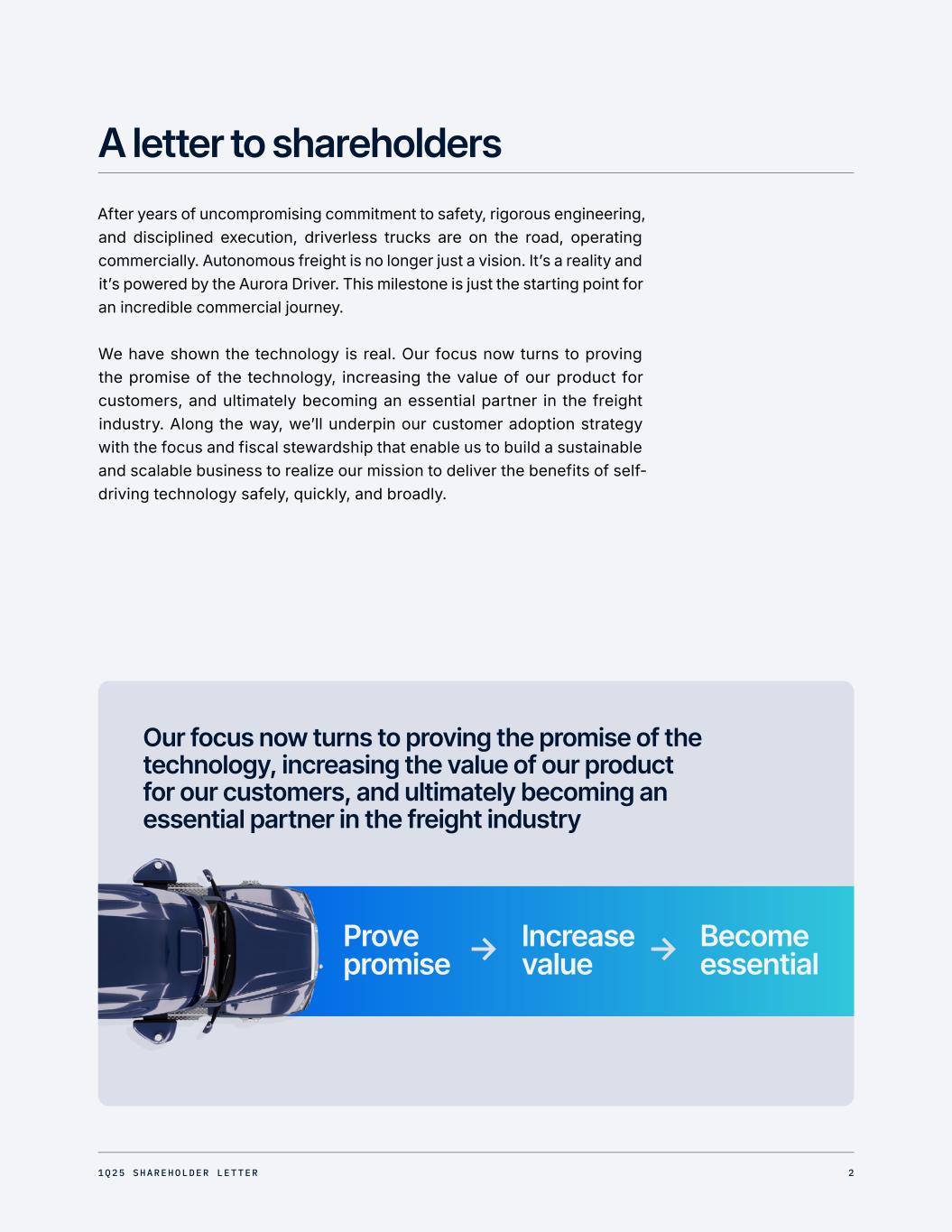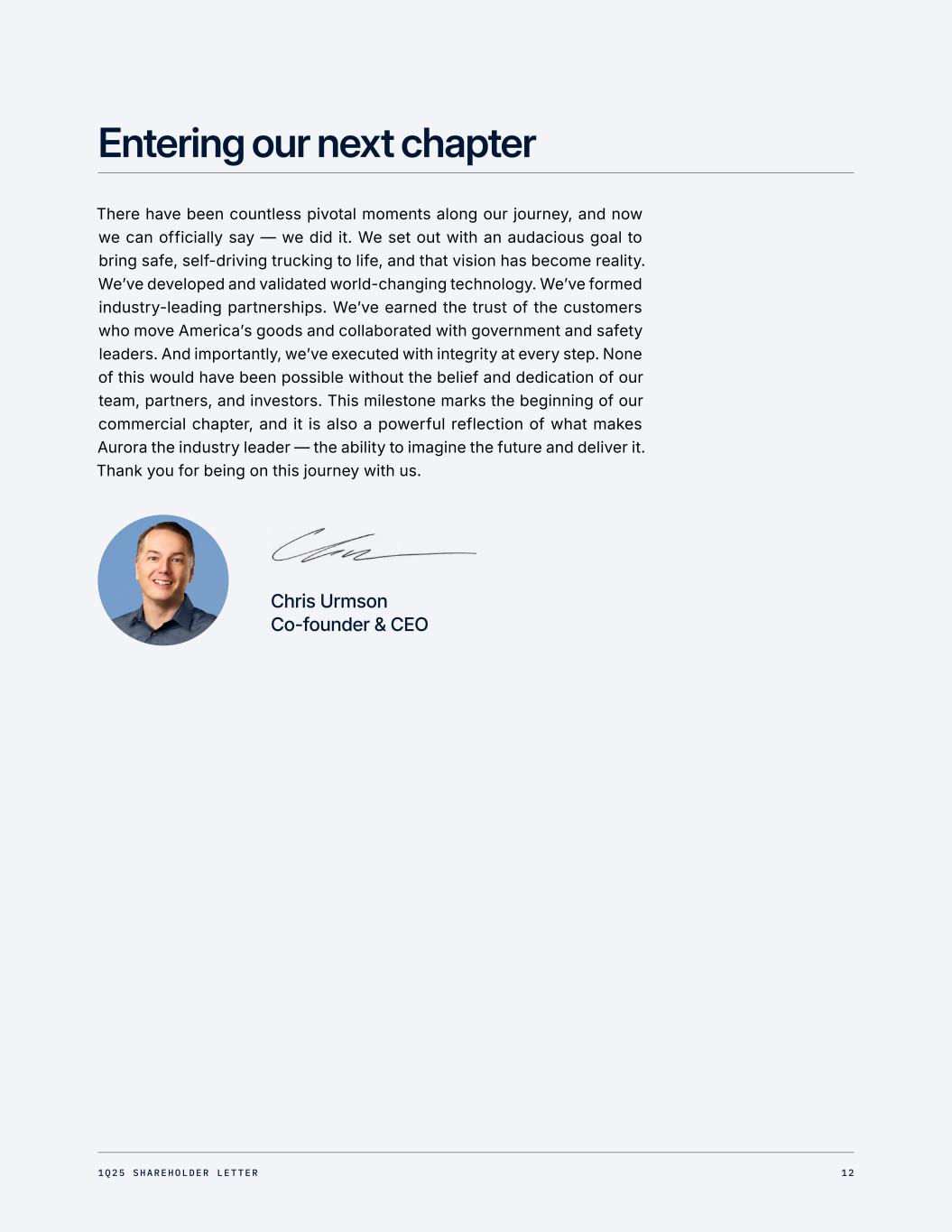 Entering our next chapter There have been countless pivotal moments along our journey, and now we can officially say — we did it. We set out with an audacious goal to bring safe, self-driving trucking to life, and that vision has become reality. We’ve developed and validated world-changing technology. We’ve formed industry-leading partnerships. We’ve earned the trust of the customers who move America’s goods and collaborated with government and safety leaders. And importantly, we’ve executed with integrity at every step. None of this would have been possible without the belief and dedication of our team, partners, and investors. This milestone marks the beginning of our commercial chapter, and it is also a powerful reflection of what makes Aurora the industry leader — the ability to imagine the future and deliver it. Thank you for being on this journey with us. Chris Urmson Co-founder & CEO 121Q25 SHAREHOLDER LETTER