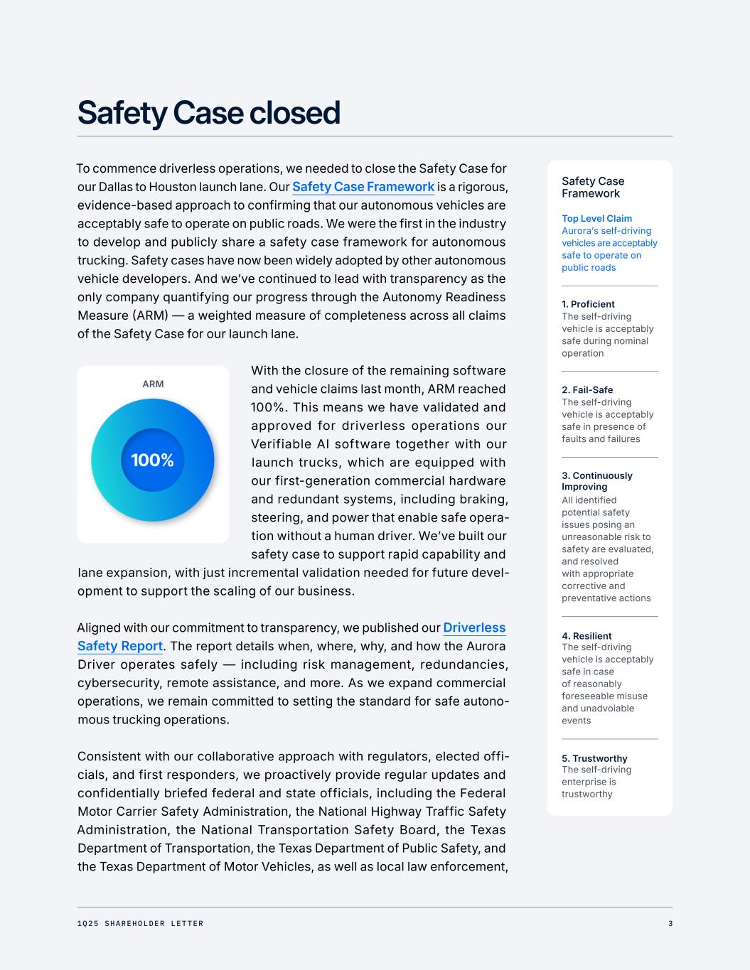 Safety Case closed To commence driverless operations, we needed to close the Safety Case for our Dallas to Houston launch lane. Our Safety Case Framework is a rigorous, evidence-based approach to confirming that our autonomous vehicles are acceptably safe to operate on public roads. We were the first in the industry to develop and publicly share a safety case framework for autonomous trucking. Safety cases have now been widely adopted by other autonomous vehicle developers. And we’ve continued to lead with transparency as the only company quantifying our progress through the Autonomy Readiness Measure (ARM) — a weighted measure of completeness across all claims of the Safety Case for our launch lane. With the closure of the remaining software and vehicle claims last month, ARM reached 100%. This means we have validated and approved for driverless operations our Verifiable AI software together with our launch trucks, which are equipped with our first-generation commercial hardware and redundant systems, including braking, steering, and power that enable safe opera- tion without a human driver. We’ve built our safety case to support rapid capability and lane expansion, with just incremental validation needed for future devel- opment to support the scaling of our business. Aligned with our commitment to transparency, we published our Driverless Safety Report. The report details when, where, why, and how the Aurora Driver operates safely — including risk management, redundancies, cybersecurity, remote assistance, and more. As we expand commercial operations, we remain committed to setting the standard for safe autono- mous trucking operations. Consistent with our collaborative approach with regulators, elected offi- cials, and first responders, we proactively provide regular updates and confidentially briefed federal and state officials, including the Federal Motor Carrier Safety Administration, the National Highway Traffic Safety Administration, the National Transportation Safety Board, the Texas Department of Transportation, the Texas Department of Public Safety, and the Texas Department of Motor Vehicles, as well as local law enforcement, Safety Case Framework Top Level Claim Aurora’s self-driving vehicles are acceptably safe to operate on public roads 1. Proficient The self-driving vehicle is acceptably safe during nominal operation 2. Fail-Safe The self-driving vehicle is acceptably safe in presence of faults and failures 3. Continuously Improving All identified potential safety issues posing an unreasonable risk to safety are evaluated, and resolved with appropriate corrective and preventative actions 4. Resilient The self-driving vehicle is acceptably safe in case of reasonably foreseeable misuse and unadvoiable events 5. Trustworthy The self-driving enterprise is trustworthy ARM 31Q25 SHAREHOLDER LETTER