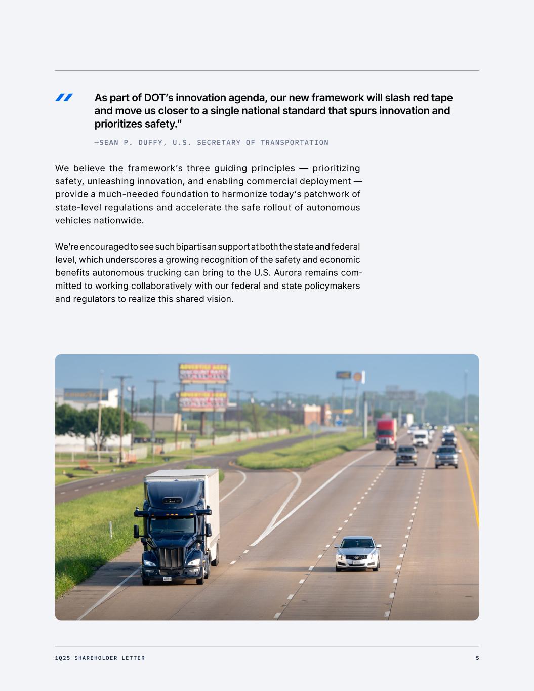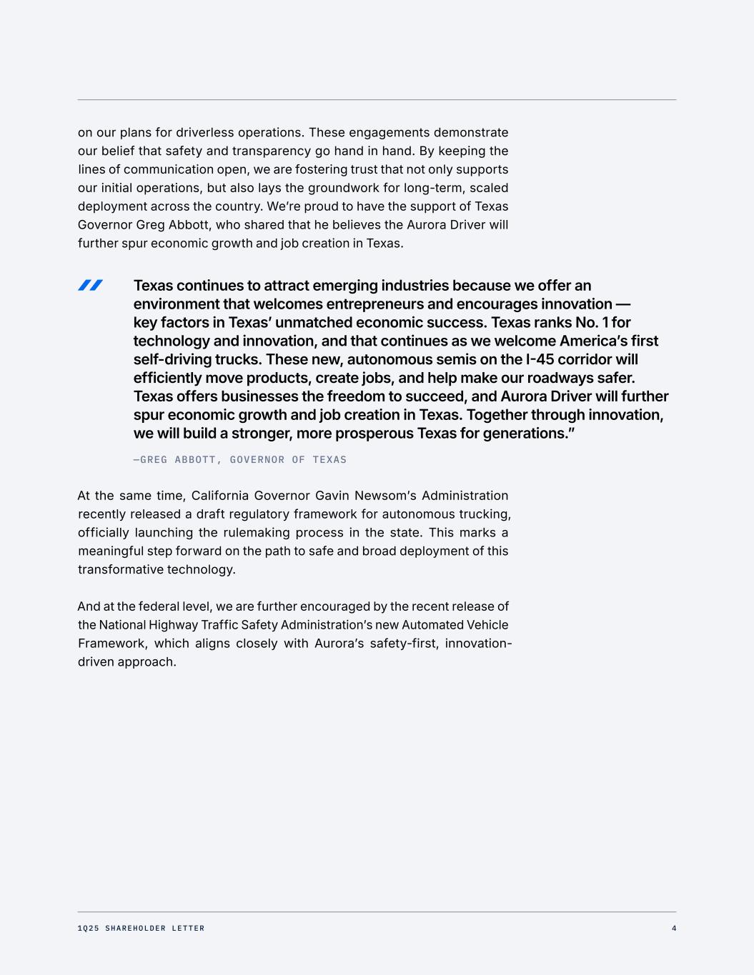 on our plans for driverless operations. These engagements demonstrate our belief that safety and transparency go hand in hand. By keeping the lines of communication open, we are fostering trust that not only supports our initial operations, but also lays the groundwork for long-term, scaled deployment across the country. We’re proud to have the support of Texas Governor Greg Abbott, who shared that he believes the Aurora Driver will further spur economic growth and job creation in Texas. At the same time, California Governor Gavin Newsom’s Administration recently released a draft regulatory framework for autonomous trucking, officially launching the rulemaking process in the state. This marks a meaningful step forward on the path to safe and broad deployment of this transformative technology. And at the federal level, we are further encouraged by the recent release of the National Highway Traffic Safety Administration’s new Automated Vehicle Framework, which aligns closely with Aurora’s safety-first, innovation- driven approach. Texas continues to attract emerging industries because we offer an environment that welcomes entrepreneurs and encourages innovation — key factors in Texas’ unmatched economic success. Texas ranks No. 1 for technology and innovation, and that continues as we welcome America’s first self-driving trucks. These new, autonomous semis on the I-45 corridor will efficiently move products, create jobs, and help make our roadways safer. Texas offers businesses the freedom to succeed, and Aurora Driver will further spur economic growth and job creation in Texas. Together through innovation, we will build a stronger, more prosperous Texas for generations.” —GREG ABBOTT, GOVERNOR OF TEXAS 41Q25 SHAREHOLDER LETTER