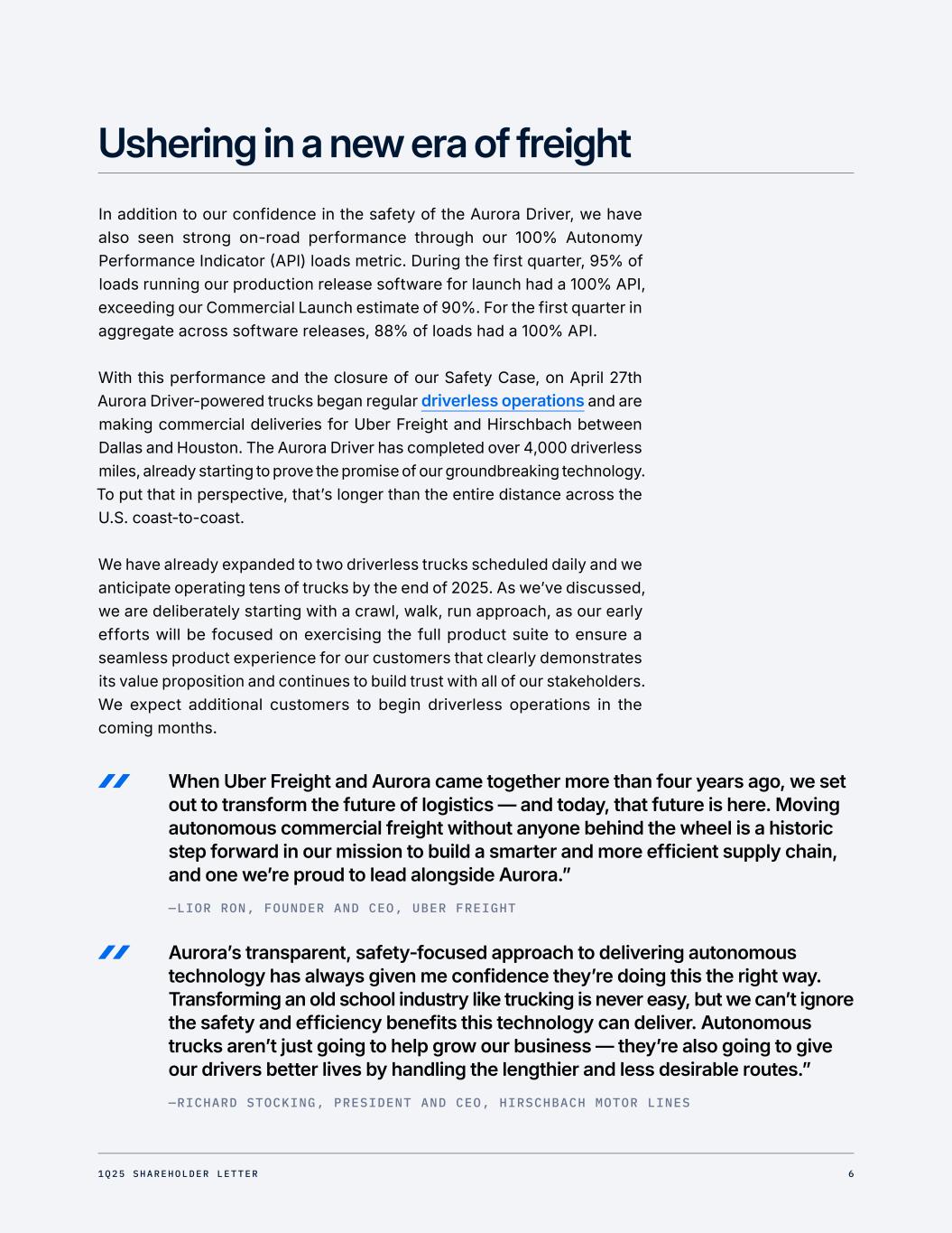 Ushering in a new era of freight In addition to our confidence in the safety of the Aurora Driver, we have also seen strong on-road performance through our 100% Autonomy Performance Indicator (API) loads metric. During the first quarter, 95% of loads running our production release software for launch had a 100% API, exceeding our Commercial Launch estimate of 90%. For the first quarter in aggregate across software releases, 88% of loads had a 100% API. With this performance and the closure of our Safety Case, on April 27th Aurora Driver-powered trucks began regular driverless operations and are making commercial deliveries for Uber Freight and Hirschbach between Dallas and Houston. The Aurora Driver has completed over 4,000 driverless miles, already starting to prove the promise of our groundbreaking technology. To put that in perspective, that’s longer than the entire distance across the U.S. coast-to-coast. We have already expanded to two driverless trucks scheduled daily and we anticipate operating tens of trucks by the end of 2025. As we’ve discussed, we are deliberately starting with a crawl, walk, run approach, as our early efforts will be focused on exercising the full product suite to ensure a seamless product experience for our customers that clearly demonstrates its value proposition and continues to build trust with all of our stakeholders. We expect additional customers to begin driverless operations in the coming months. When Uber Freight and Aurora came together more than four years ago, we set out to transform the future of logistics — and today, that future is here. Moving autonomous commercial freight without anyone behind the wheel is a historic step forward in our mission to build a smarter and more efficient supply chain, and one we’re proud to lead alongside Aurora.” —LIOR RON, FOUNDER AND CEO, UBER FREIGHT Aurora’s transparent, safety-focused approach to delivering autonomous technology has always given me confidence they’re doing this the right way. Transforming an old school industry like trucking is never easy, but we can’t ignore the safety and efficiency benefits this technology can deliver. Autonomous trucks aren’t just going to help grow our business — they’re also going to give our drivers better lives by handling the lengthier and less desirable routes.” —RICHARD STOCKING, PRESIDENT AND CEO, HIRSCHBACH MOTOR LINES 61Q25 SHAREHOLDER LETTER