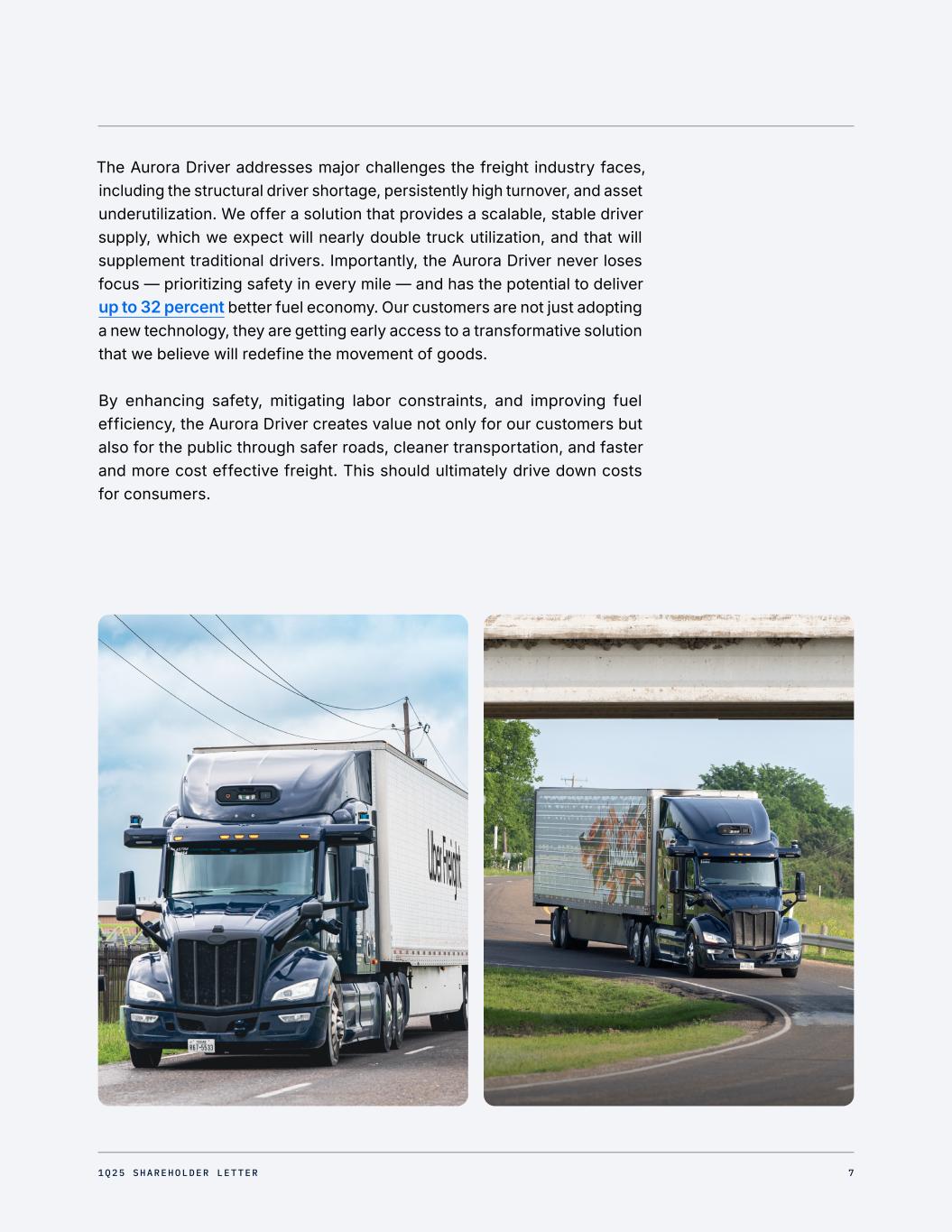 The Aurora Driver addresses major challenges the freight industry faces, including the structural driver shortage, persistently high turnover, and asset underutilization. We offer a solution that provides a scalable, stable driver supply, which we expect will nearly double truck utilization, and that will supplement traditional drivers. Importantly, the Aurora Driver never loses focus — prioritizing safety in every mile — and has the potential to deliver up to 32 percent better fuel economy. Our customers are not just adopting a new technology, they are getting early access to a transformative solution that we believe will redefine the movement of goods. By enhancing safety, mitigating labor constraints, and improving fuel efficiency, the Aurora Driver creates value not only for our customers but also for the public through safer roads, cleaner transportation, and faster and more cost effective freight. This should ultimately drive down costs for consumers. 71Q25 SHAREHOLDER LETTER