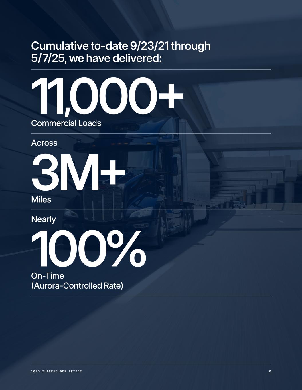 11,000+ Commercial Loads 3M+ Miles Across 100% On-Time (Aurora-Controlled Rate) Nearly Cumulative to-date 9/23/21 through 5/7/25, we have delivered: 81Q25 SHAREHOLDER LETTER