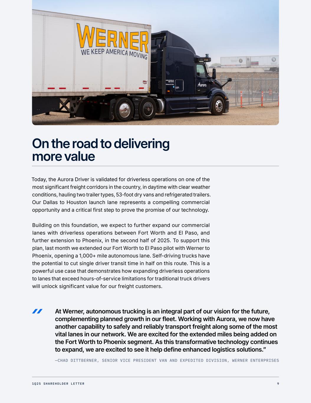 On the road to delivering more value Today, the Aurora Driver is validated for driverless operations on one of the most significant freight corridors in the country, in daytime with clear weather conditions, hauling two trailer types, 53-foot dry vans and refrigerated trailers. Our Dallas to Houston launch lane represents a compelling commercial opportunity and a critical first step to prove the promise of our technology. Building on this foundation, we expect to further expand our commercial lanes with driverless operations between Fort Worth and El Paso, and further extension to Phoenix, in the second half of 2025. To support this plan, last month we extended our Fort Worth to El Paso pilot with Werner to Phoenix, opening a 1,000+ mile autonomous lane. Self-driving trucks have the potential to cut single driver transit time in half on this route. This is a powerful use case that demonstrates how expanding driverless operations to lanes that exceed hours-of-service limitations for traditional truck drivers will unlock significant value for our freight customers. At Werner, autonomous trucking is an integral part of our vision for the future, complementing planned growth in our fleet. Working with Aurora, we now have another capability to safely and reliably transport freight along some of the most vital lanes in our network. We are excited for the extended miles being added on the Fort Worth to Phoenix segment. As this transformative technology continues to expand, we are excited to see it help define enhanced logistics solutions.” —CHAD DITTBERNER, SENIOR VICE PRESIDENT VAN AND EXPEDITED DIVISION, WERNER ENTERPRISES 91Q25 SHAREHOLDER LETTER