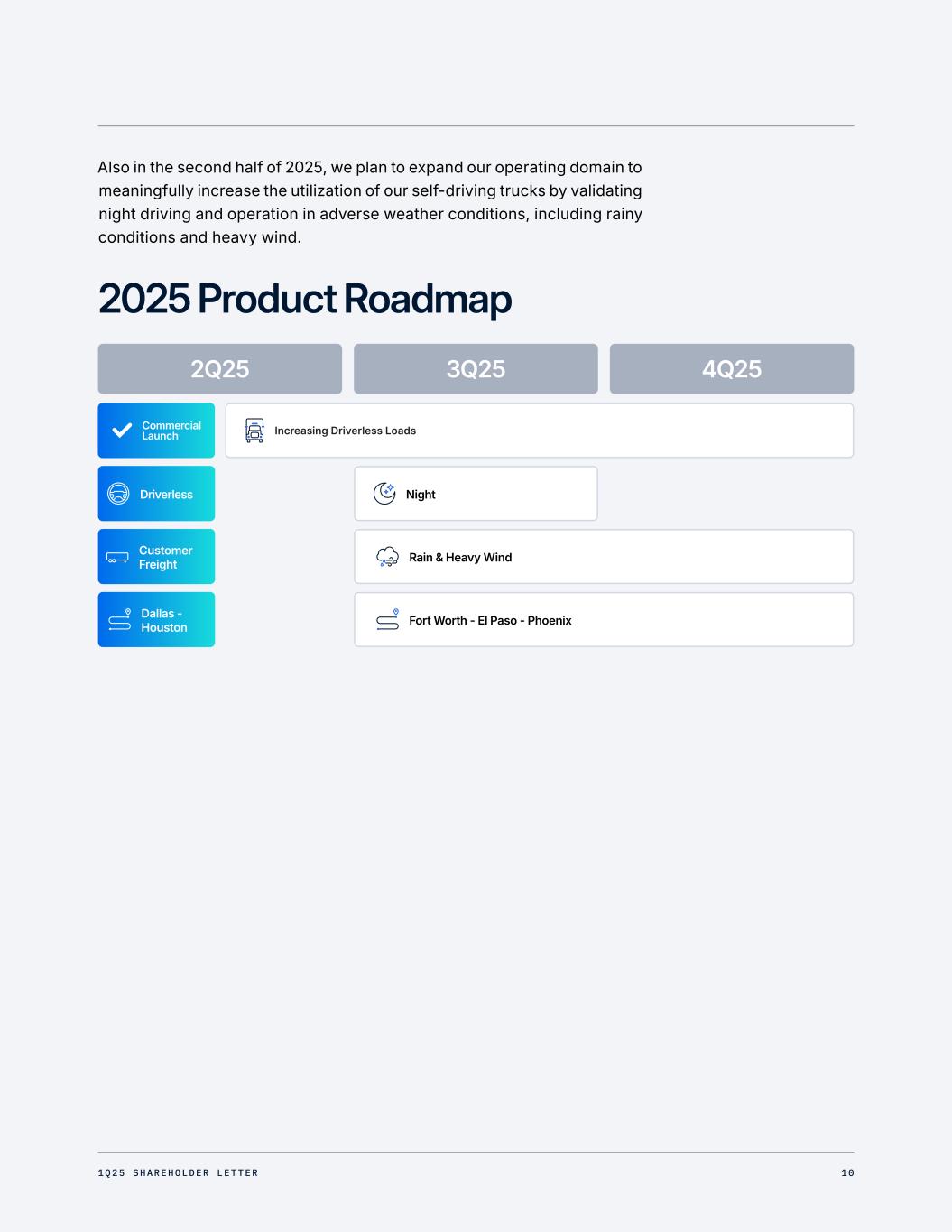 Also in the second half of 2025, we plan to expand our operating domain to meaningfully increase the utilization of our self-driving trucks by validating night driving and operation in adverse weather conditions, including rainy conditions and heavy wind. 2025 Product Roadmap 101Q25 SHAREHOLDER LETTER