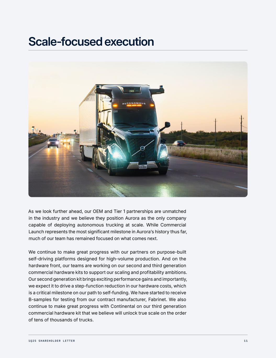 Scale-focused execution As we look further ahead, our OEM and Tier 1 partnerships are unmatched in the industry and we believe they position Aurora as the only company capable of deploying autonomous trucking at scale. While Commercial Launch represents the most significant milestone in Aurora’s history thus far, much of our team has remained focused on what comes next. We continue to make great progress with our partners on purpose-built self-driving platforms designed for high-volume production. And on the hardware front, our teams are working on our second and third generation commercial hardware kits to support our scaling and profitability ambitions. Our second generation kit brings exciting performance gains and importantly, we expect it to drive a step-function reduction in our hardware costs, which is a critical milestone on our path to self-funding. We have started to receive B-samples for testing from our contract manufacturer, Fabrinet. We also continue to make great progress with Continental on our third generation commercial hardware kit that we believe will unlock true scale on the order of tens of thousands of trucks. 111Q25 SHAREHOLDER LETTER