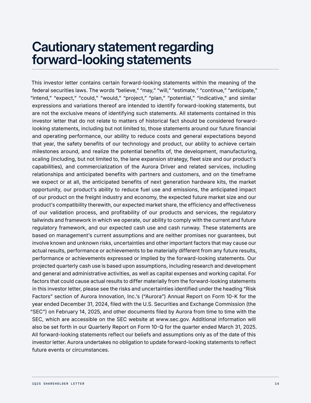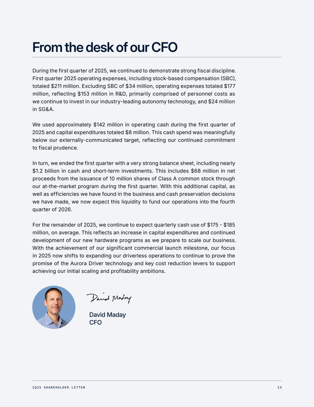 David Maday CFO From the desk of our CFO During the first quarter of 2025, we continued to demonstrate strong fiscal discipline. First quarter 2025 operating expenses, including stock-based compensation (SBC), totaled $211 million. Excluding SBC of $34 million, operating expenses totaled $177 million, reflecting $153 million in R&D, primarily comprised of personnel costs as we continue to invest in our industry-leading autonomy technology, and $24 million in SG&A. We used approximately $142 million in operating cash during the first quarter of 2025 and capital expenditures totaled $8 million. This cash spend was meaningfully below our externally-communicated target, reflecting our continued commitment to fiscal prudence. In turn, we ended the first quarter with a very strong balance sheet, including nearly $1.2 billion in cash and short-term investments. This includes $68 million in net proceeds from the issuance of 10 million shares of Class A common stock through our at-the-market program during the first quarter. With this additional capital, as well as efficiencies we have found in the business and cash preservation decisions we have made, we now expect this liquidity to fund our operations into the fourth quarter of 2026. For the remainder of 2025, we continue to expect quarterly cash use of $175 - $185 million, on average. This reflects an increase in capital expenditures and continued development of our new hardware programs as we prepare to scale our business. With the achievement of our significant commercial launch milestone, our focus in 2025 now shifts to expanding our driverless operations to continue to prove the promise of the Aurora Driver technology and key cost reduction levers to support achieving our initial scaling and profitability ambitions. 131Q25 SHAREHOLDER LETTER