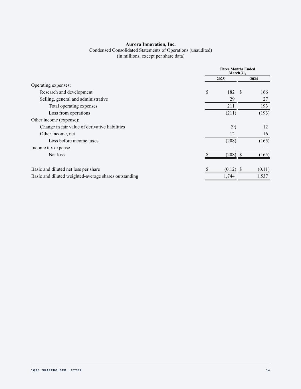 Aurora Innovation, Inc. Condensed Consolidated Statements of Operations (unaudited) (in millions, except per share data) Three Months Ended March 31, 2025 2024 Operating expenses: Research and development $ 182 $ 166 Selling, general and administrative 29 27 Total operating expenses 211 193 Loss from operations (211) (193) Other income (expense): Change in fair value of derivative liabilities (9) 12 Other income, net 12 16 Loss before income taxes (208) (165) Income tax expense — — Net loss $ (208) $ (165) Basic and diluted net loss per share $ (0.12) $ (0.11) Basic and diluted weighted-average shares outstanding 1,744 1,537 161Q25 SHAREHOLDER LETTER