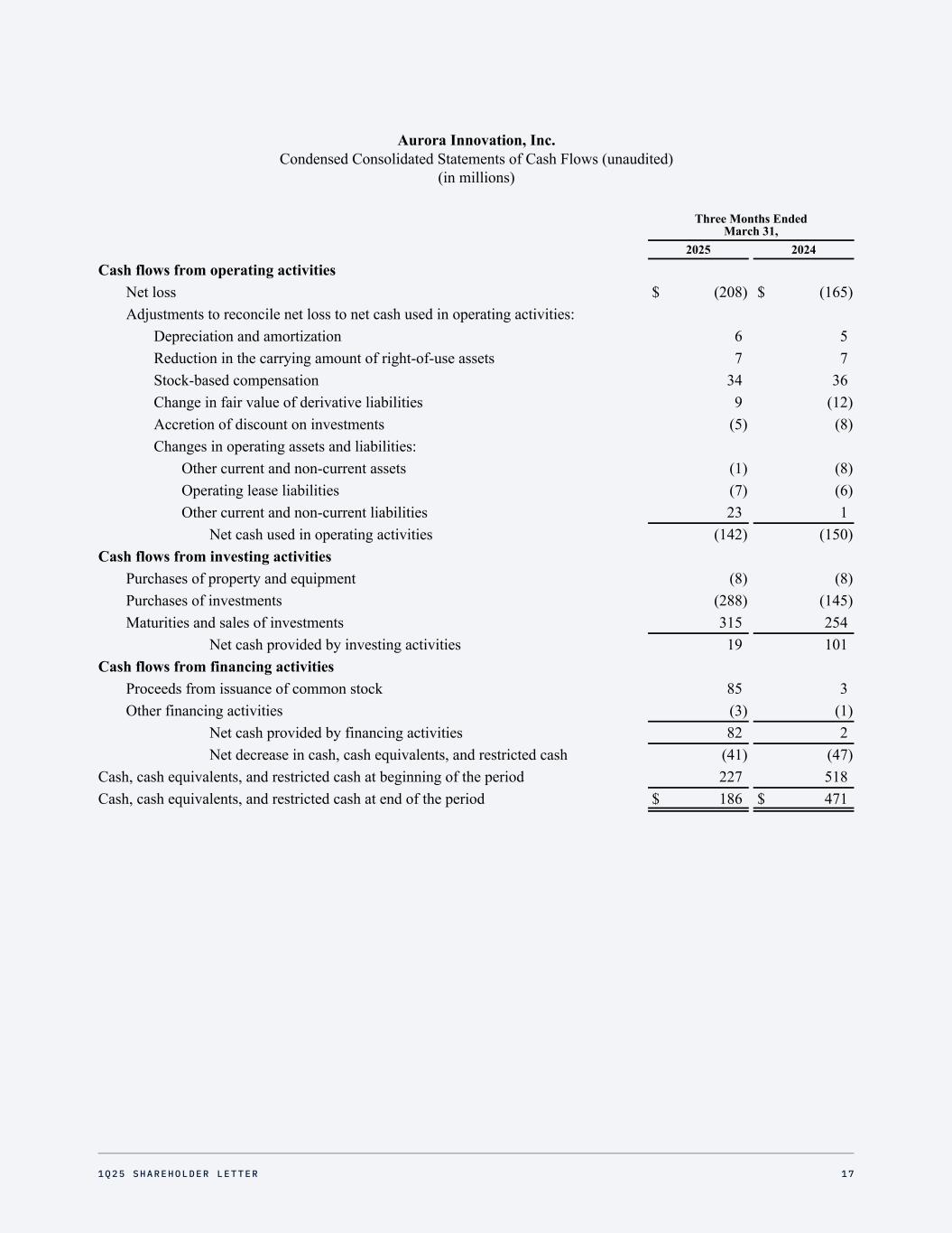 Aurora Innovation, Inc. Condensed Consolidated Statements of Cash Flows (unaudited) (in millions) Three Months Ended March 31, 2025 2024 Cash flows from operating activities Net loss $ (208) $ (165) Adjustments to reconcile net loss to net cash used in operating activities: Depreciation and amortization 6 5 Reduction in the carrying amount of right-of-use assets 7 7 Stock-based compensation 34 36 Change in fair value of derivative liabilities 9 (12) Accretion of discount on investments (5) (8) Changes in operating assets and liabilities: Other current and non-current assets (1) (8) Operating lease liabilities (7) (6) Other current and non-current liabilities 23 1 Net cash used in operating activities (142) (150) Cash flows from investing activities Purchases of property and equipment (8) (8) Purchases of investments (288) (145) Maturities and sales of investments 315 254 Net cash provided by investing activities 19 101 Cash flows from financing activities Proceeds from issuance of common stock 85 3 Other financing activities (3) (1) Net cash provided by financing activities 82 2 Net decrease in cash, cash equivalents, and restricted cash (41) (47) Cash, cash equivalents, and restricted cash at beginning of the period 227 518 Cash, cash equivalents, and restricted cash at end of the period $ 186 $ 471 171Q25 SHAREHOLDER LETTER