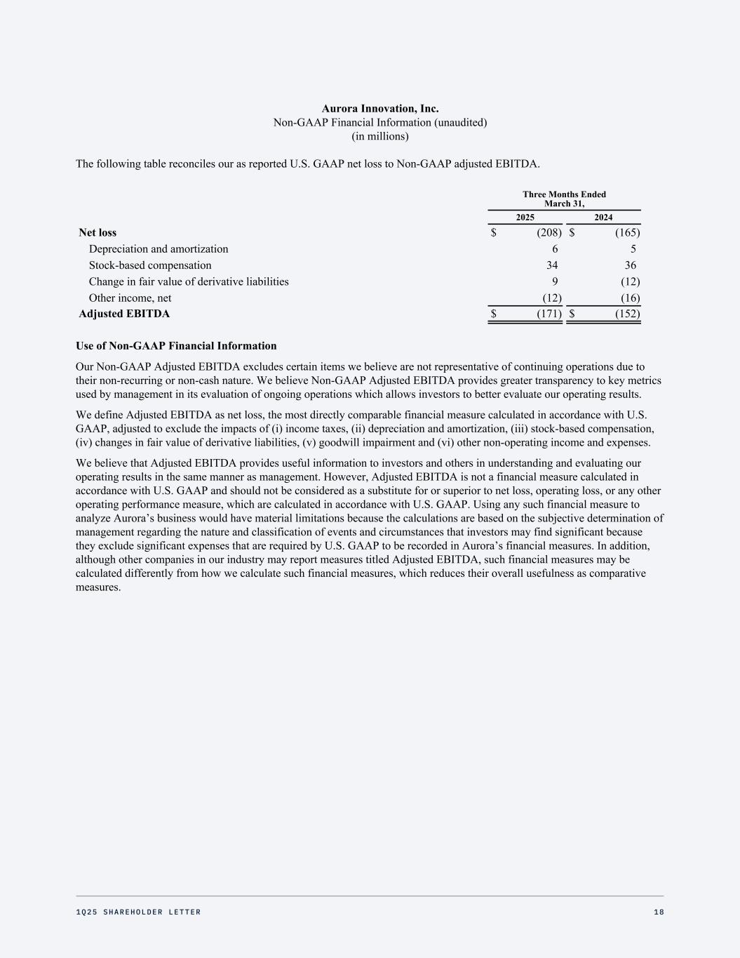 Aurora Innovation, Inc. Non-GAAP Financial Information (unaudited) (in millions) The following table reconciles our as reported U.S. GAAP net loss to Non-GAAP adjusted EBITDA. Three Months Ended March 31, 2025 2024 Net loss $ (208) $ (165) Depreciation and amortization 6 5 Stock-based compensation 34 36 Change in fair value of derivative liabilities 9 (12) Other income, net (12) (16) Adjusted EBITDA $ (171) $ (152) Use of Non-GAAP Financial Information Our Non-GAAP Adjusted EBITDA excludes certain items we believe are not representative of continuing operations due to their non-recurring or non-cash nature. We believe Non-GAAP Adjusted EBITDA provides greater transparency to key metrics used by management in its evaluation of ongoing operations which allows investors to better evaluate our operating results. We define Adjusted EBITDA as net loss, the most directly comparable financial measure calculated in accordance with U.S. GAAP, adjusted to exclude the impacts of (i) income taxes, (ii) depreciation and amortization, (iii) stock-based compensation, (iv) changes in fair value of derivative liabilities, (v) goodwill impairment and (vi) other non-operating income and expenses. We believe that Adjusted EBITDA provides useful information to investors and others in understanding and evaluating our operating results in the same manner as management. However, Adjusted EBITDA is not a financial measure calculated in accordance with U.S. GAAP and should not be considered as a substitute for or superior to net loss, operating loss, or any other operating performance measure, which are calculated in accordance with U.S. GAAP. Using any such financial measure to analyze Aurora’s business would have material limitations because the calculations are based on the subjective determination of management regarding the nature and classification of events and circumstances that investors may find significant because they exclude significant expenses that are required by U.S. GAAP to be recorded in Aurora’s financial measures. In addition, although other companies in our industry may report measures titled Adjusted EBITDA, such financial measures may be calculated differently from how we calculate such financial measures, which reduces their overall usefulness as comparative measures. 181Q25 SHAREHOLDER LETTER