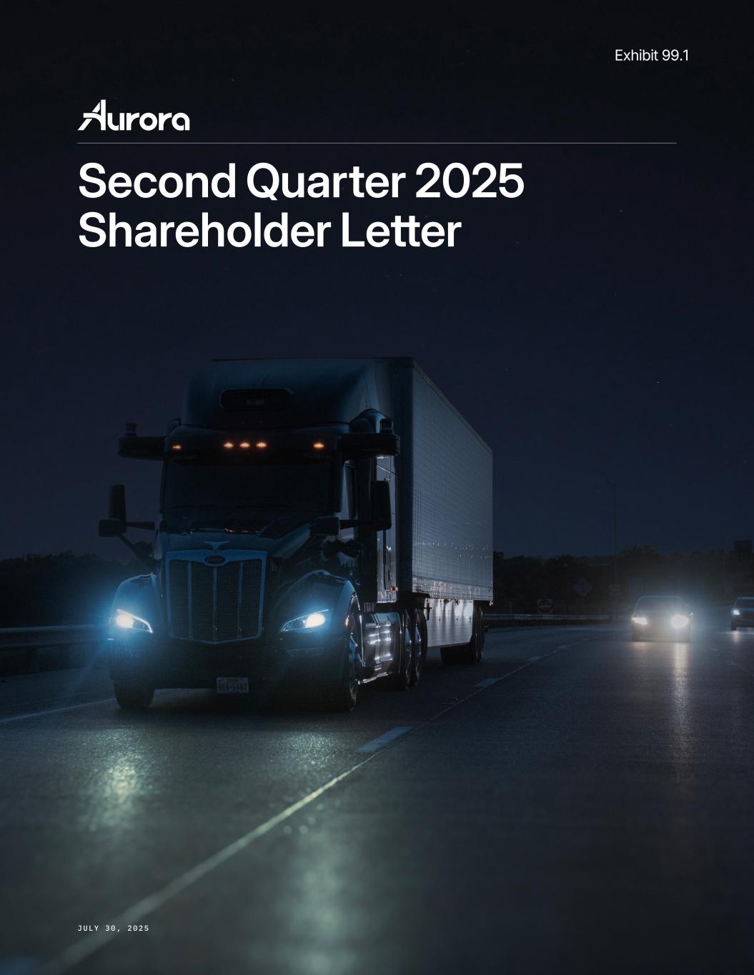 Cautionary statement regarding forward-looking statements This investor letter contains certain forward-looking statements within the meaning of the federal securities laws. The words “believe,” “may,” “will,” “estimate,” “continue,” “anticipate,” “intend,” “expect,” “could,” “would,” “project,” “plan,” “potential,” “indicative,” and similar expressions and variations thereof are intended to identify forward-looking statements, but are not the exclusive means of identifying such statements. All statements contained in this investor letter that do not relate to matters of historical fact should be considered forward- looking statements, including but not limited to, those statements around our driverless operations and future financial and operating performance; our ability to reduce costs and general expectations beyond that year; the safety benefits of our technology and product; our ability to achieve certain milestones around, and realize the potential benefits of, the development, manufacturing, scaling (including, but not limited to, the lane expansion strategy, fleet size and our product’s availability and capabilities) and commercialization of the Aurora Driver and related services, on the timeframe we expect or at all; our relationships with our partners and customers and anticipated benefits that they may derive from our product (including, but not limited to, increasing revenues and margins); the timing for developing, and the anticipated benefits of, next generation hardware kits; the anticipated impact of our product on the freight industry and economy; our expected market share and competitive position; the efficiency and effectiveness of our validation process and profitability of our products and services; the regulatory tailwinds and framework in which we operate and our ability to comply with the current and future regulatory framework; and our expected cash use and cash runway. These statements are based on management’s current assumptions and are neither promises nor guarantees, but involve known and unknown risks, uncertainties and other important factors that may cause our actual results, performance or achievements to be materially different from any future results, performance or achievements expressed or implied by the forward-looking statements. Our projected quarterly cash use is based upon assumptions, including research and development and general and administrative activities, as well as capital expenses and working capital. For factors that could cause actual results to differ materially from the forward-looking statements in this investor letter, please see the risks and uncertainties identified under the heading “Risk Factors” section of Aurora Innovation, Inc.’s (“Aurora”) Annual Report on Form 10-K for the year ended December 31, 2024, filed with the U.S. Securities and Exchange Commission (the “SEC”) on February 14, 2025, and other documents filed by Aurora from time to time with the SEC, which are accessible on the SEC website at www.sec.gov. Additional information will also be set forth in our Quarterly Report on Form 10-Q for the quarter ended June 30, 2025. All forward-looking statements reflect our beliefs and assumptions only as of the date of this investor letter. Aurora undertakes no obligation to update forward-looking statements to reflect future events or circumstances. 142Q25 SHAREHOLDER LETTER