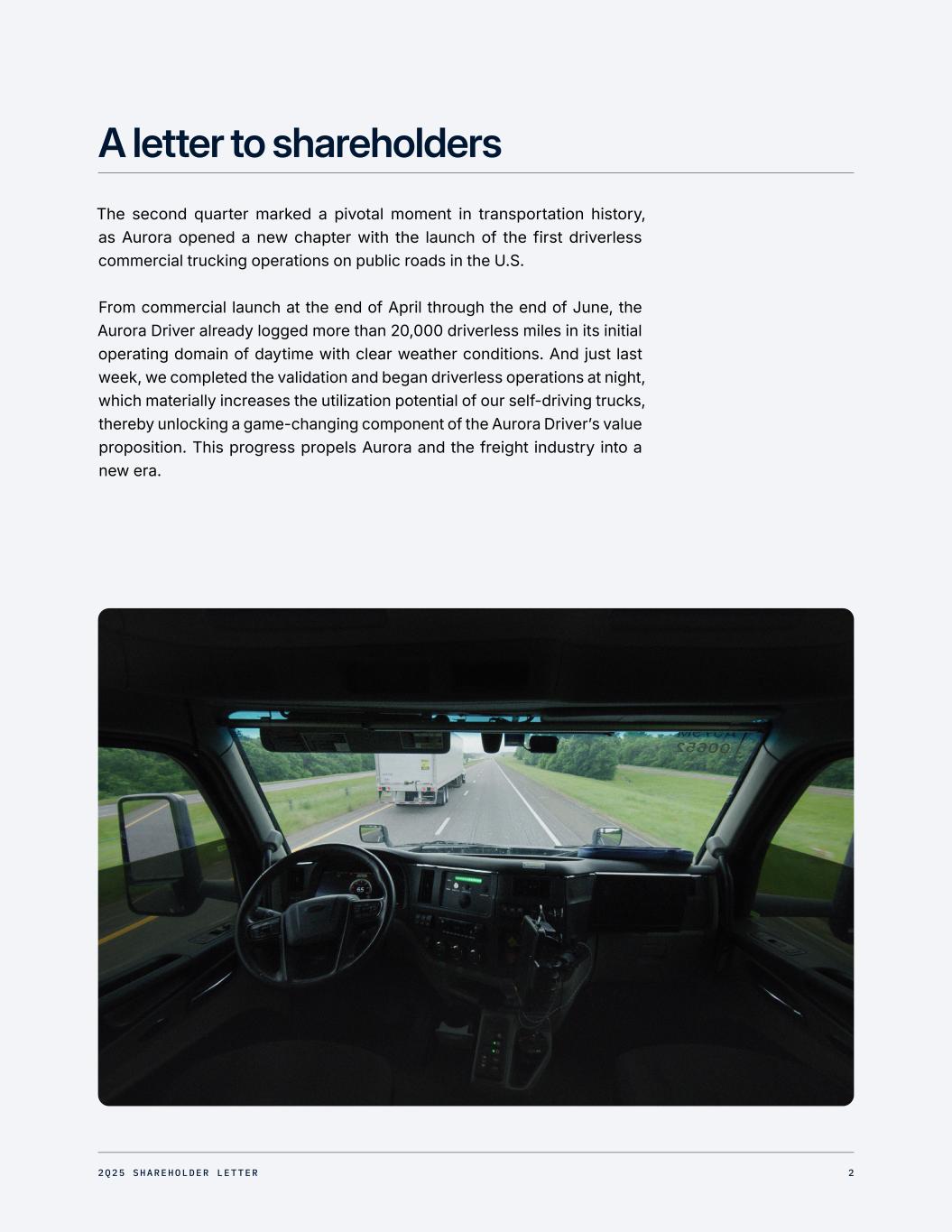 A letter to shareholders The second quarter marked a pivotal moment in transportation history, as Aurora opened a new chapter with the launch of the first driverless commercial trucking operations on public roads in the U.S. From commercial launch at the end of April through the end of June, the Aurora Driver already logged more than 20,000 driverless miles in its initial operating domain of daytime with clear weather conditions. And just last week, we completed the validation and began driverless operations at night, which materially increases the utilization potential of our self-driving trucks, thereby unlocking a game-changing component of the Aurora Driver’s value proposition. This progress propels Aurora and the freight industry into a new era. 22Q25 SHAREHOLDER LETTER