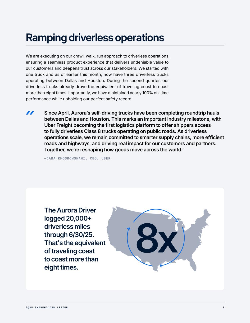 Ramping driverless operations We are executing on our crawl, walk, run approach to driverless operations, ensuring a seamless product experience that delivers undeniable value to our customers and deepens trust across our stakeholders. We started with one truck and as of earlier this month, now have three driverless trucks operating between Dallas and Houston. During the second quarter, our driverless trucks already drove the equivalent of traveling coast to coast more than eight times. Importantly, we have maintained nearly 100% on-time performance while upholding our perfect safety record. Since April, Aurora’s self-driving trucks have been completing roundtrip hauls between Dallas and Houston. This marks an important industry milestone, with Uber Freight becoming the first logistics platform to offer shippers access to fully driverless Class 8 trucks operating on public roads. As driverless operations scale, we remain committed to smarter supply chains, more efficient roads and highways, and driving real impact for our customers and partners. Together, we’re reshaping how goods move across the world.” —DARA KHOSROWSHAHI, CEO, UBER 8x The Aurora Driver logged 20,000+ driverless miles through 6/30/25. That's the equivalent of traveling coast to coast more than eight times. 32Q25 SHAREHOLDER LETTER