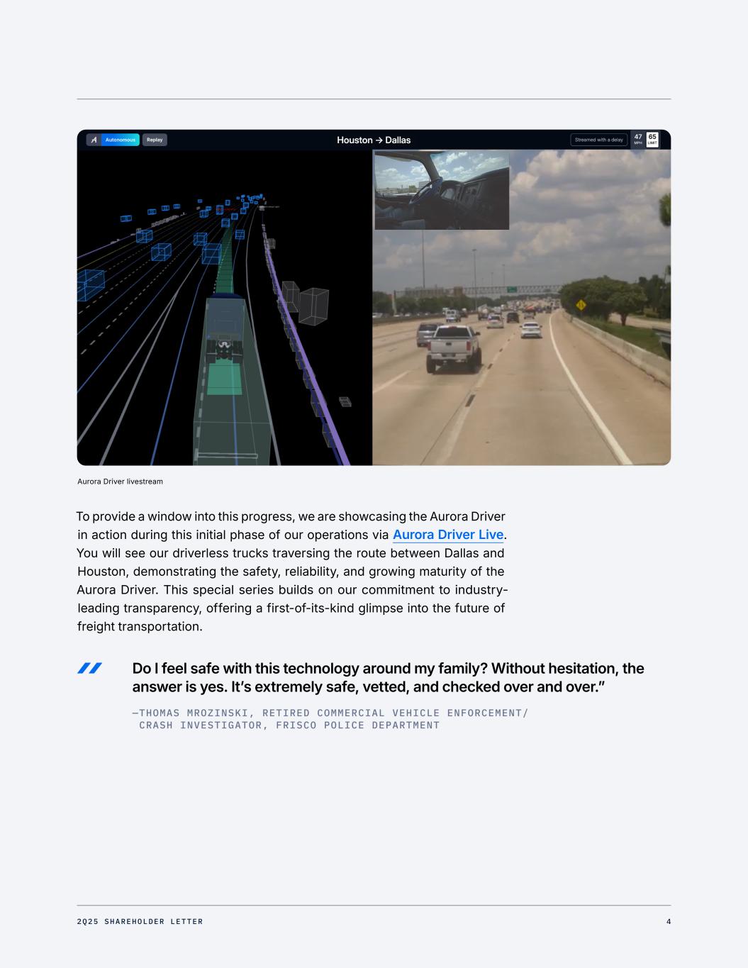 To provide a window into this progress, we are showcasing the Aurora Driver in action during this initial phase of our operations via Aurora Driver Live. You will see our driverless trucks traversing the route between Dallas and Houston, demonstrating the safety, reliability, and growing maturity of the Aurora Driver. This special series builds on our commitment to industry- leading transparency, offering a first-of-its-kind glimpse into the future of freight transportation. Do I feel safe with this technology around my family? Without hesitation, the answer is yes. It’s extremely safe, vetted, and checked over and over.” — THOMAS MROZINSKI, RETIRED COMMERCIAL VEHICLE ENFORCEMENT/ CRASH INVESTIGATOR, FRISCO POLICE DEPARTMENT Aurora Driver livestream 42Q25 SHAREHOLDER LETTER