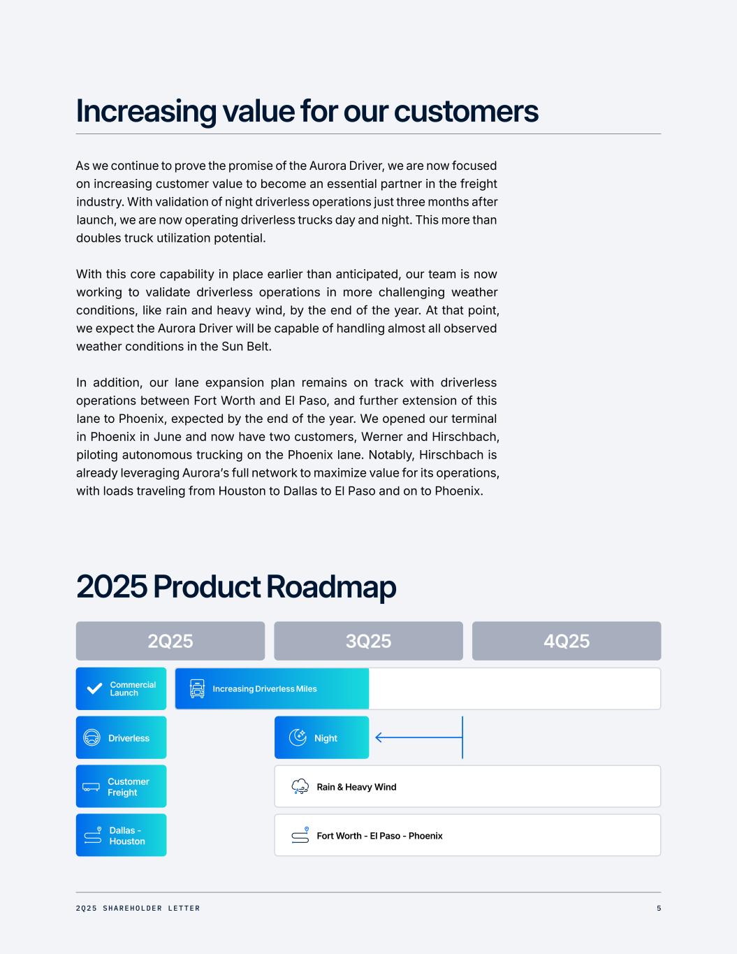 Increasing value for our customers As we continue to prove the promise of the Aurora Driver, we are now focused on increasing customer value to become an essential partner in the freight industry. With validation of night driverless operations just three months after launch, we are now operating driverless trucks day and night. This more than doubles truck utilization potential. With this core capability in place earlier than anticipated, our team is now working to validate driverless operations in more challenging weather conditions, like rain and heavy wind, by the end of the year. At that point, we expect the Aurora Driver will be capable of handling almost all observed weather conditions in the Sun Belt. In addition, our lane expansion plan remains on track with driverless operations between Fort Worth and El Paso, and further extension of this lane to Phoenix, expected by the end of the year. We opened our terminal in Phoenix in June and now have two customers, Werner and Hirschbach, piloting autonomous trucking on the Phoenix lane. Notably, Hirschbach is already leveraging Aurora’s full network to maximize value for its operations, with loads traveling from Houston to Dallas to El Paso and on to Phoenix. 2025 Product Roadmap Increasing Driverless Miles 52Q25 SHAREHOLDER LETTER