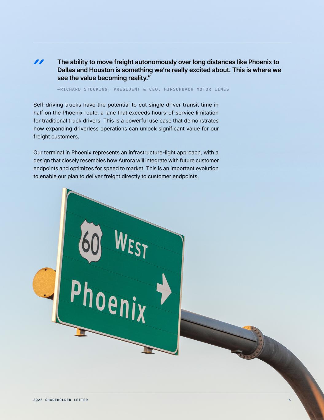 Self-driving trucks have the potential to cut single driver transit time in half on the Phoenix route, a lane that exceeds hours-of-service limitation for traditional truck drivers. This is a powerful use case that demonstrates how expanding driverless operations can unlock significant value for our freight customers. Our terminal in Phoenix represents an infrastructure-light approach, with a design that closely resembles how Aurora will integrate with future customer endpoints and optimizes for speed to market. This is an important evolution to enable our plan to deliver freight directly to customer endpoints. The ability to move freight autonomously over long distances like Phoenix to Dallas and Houston is something we’re really excited about. This is where we see the value becoming reality.” —RICHARD STOCKING, PRESIDENT & CEO, HIRSCHBACH MOTOR LINES 62Q25 SHAREHOLDER LETTER