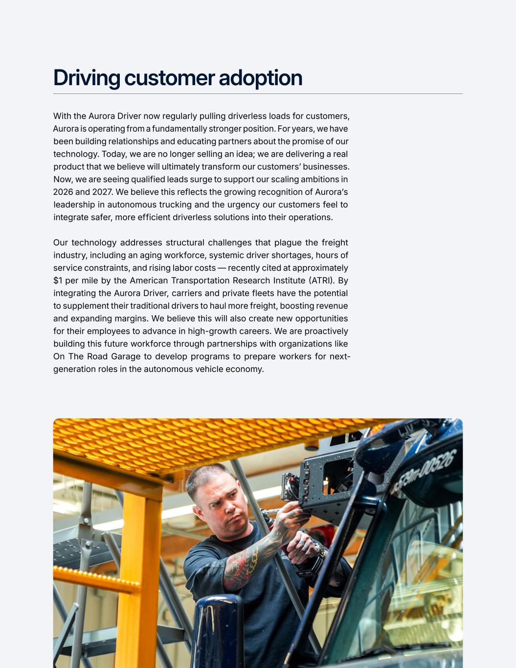 Driving customer adoption With the Aurora Driver now regularly pulling driverless loads for customers, Aurora is operating from a fundamentally stronger position. For years, we have been building relationships and educating partners about the promise of our technology. Today, we are no longer selling an idea; we are delivering a real product that we believe will ultimately transform our customers’ businesses. Now, we are seeing qualified leads surge to support our scaling ambitions in 2026 and 2027. We believe this reflects the growing recognition of Aurora’s leadership in autonomous trucking and the urgency our customers feel to integrate safer, more efficient driverless solutions into their operations. Our technology addresses structural challenges that plague the freight industry, including an aging workforce, systemic driver shortages, hours of service constraints, and rising labor costs — recently cited at approximately $1 per mile by the American Transportation Research Institute (ATRI). By integrating the Aurora Driver, carriers and private fleets have the potential to supplement their traditional drivers to haul more freight, boosting revenue and expanding margins. We believe this will also create new opportunities for their employees to advance in high-growth careers. We are proactively building this future workforce through partnerships with organizations like On The Road Garage to develop programs to prepare workers for next- generation roles in the autonomous vehicle economy.