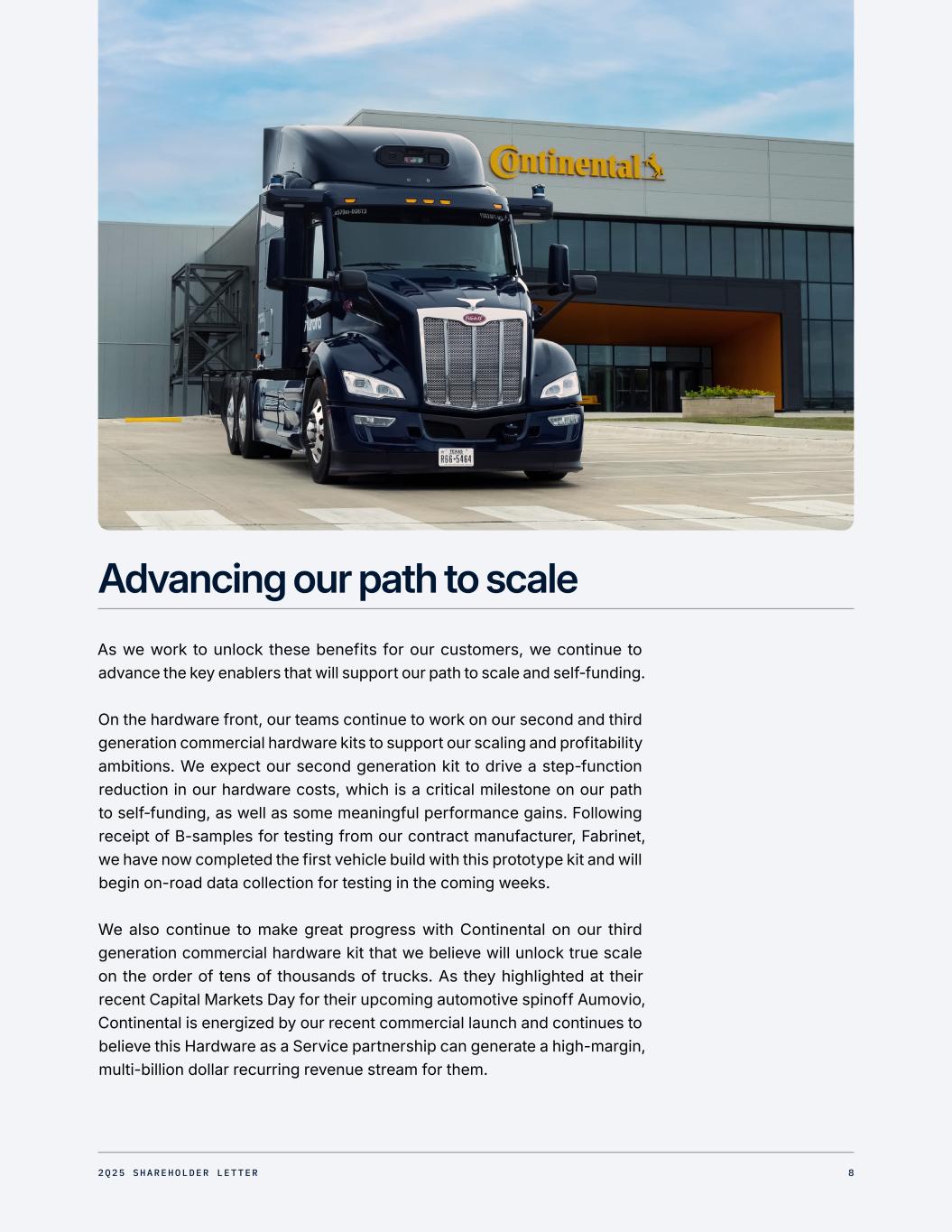 Advancing our path to scale As we work to unlock these benefits for our customers, we continue to advance the key enablers that will support our path to scale and self-funding. On the hardware front, our teams continue to work on our second and third generation commercial hardware kits to support our scaling and profitability ambitions. We expect our second generation kit to drive a step-function reduction in our hardware costs, which is a critical milestone on our path to self-funding, as well as some meaningful performance gains. Following receipt of B-samples for testing from our contract manufacturer, Fabrinet, we have now completed the first vehicle build with this prototype kit and will begin on-road data collection for testing in the coming weeks. We also continue to make great progress with Continental on our third generation commercial hardware kit that we believe will unlock true scale on the order of tens of thousands of trucks. As they highlighted at their recent Capital Markets Day for their upcoming automotive spinoff Aumovio, Continental is energized by our recent commercial launch and continues to believe this Hardware as a Service partnership can generate a high-margin, multi-billion dollar recurring revenue stream for them. 82Q25 SHAREHOLDER LETTER