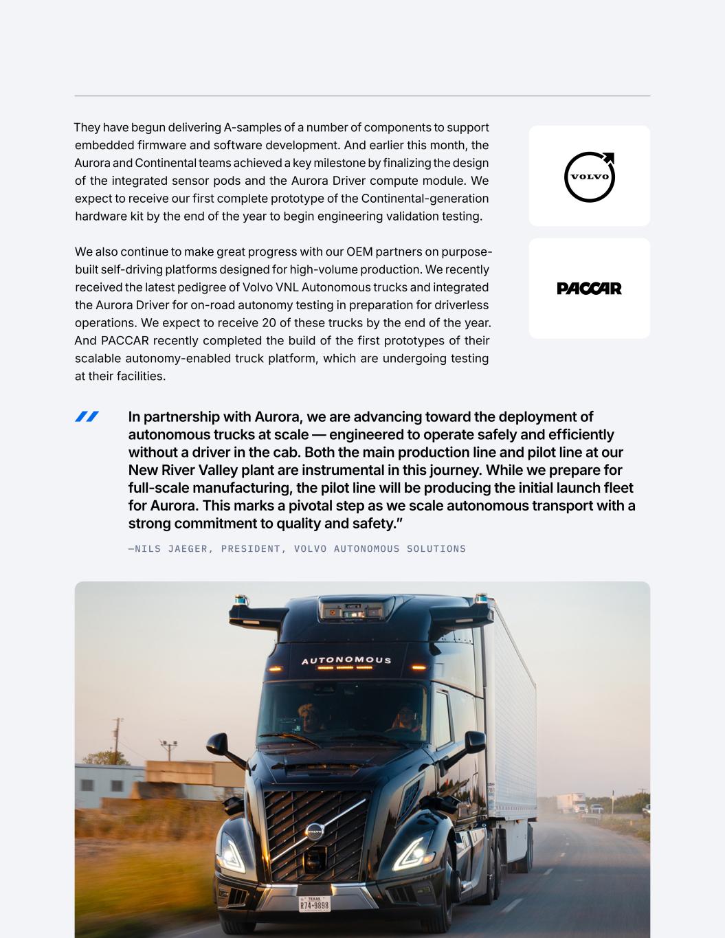 They have begun delivering A-samples of a number of components to support embedded firmware and software development. And earlier this month, the Aurora and Continental teams achieved a key milestone by finalizing the design of the integrated sensor pods and the Aurora Driver compute module. We expect to receive our first complete prototype of the Continental-generation hardware kit by the end of the year to begin engineering validation testing. We also continue to make great progress with our OEM partners on purpose- built self-driving platforms designed for high-volume production. We recently received the latest pedigree of Volvo VNL Autonomous trucks and integrated the Aurora Driver for on-road autonomy testing in preparation for driverless operations. We expect to receive 20 of these trucks by the end of the year. And PACCAR recently completed the build of the first prototypes of their scalable autonomy-enabled truck platform, which are undergoing testing at their facilities. In partnership with Aurora, we are advancing toward the deployment of autonomous trucks at scale — engineered to operate safely and efficiently without a driver in the cab. Both the main production line and pilot line at our New River Valley plant are instrumental in this journey. While we prepare for full-scale manufacturing, the pilot line will be producing the initial launch fleet for Aurora. This marks a pivotal step as we scale autonomous transport with a strong commitment to quality and safety.” —NILS JAEGER, PRESIDENT, VOLVO AUTONOMOUS SOLUTIONS
