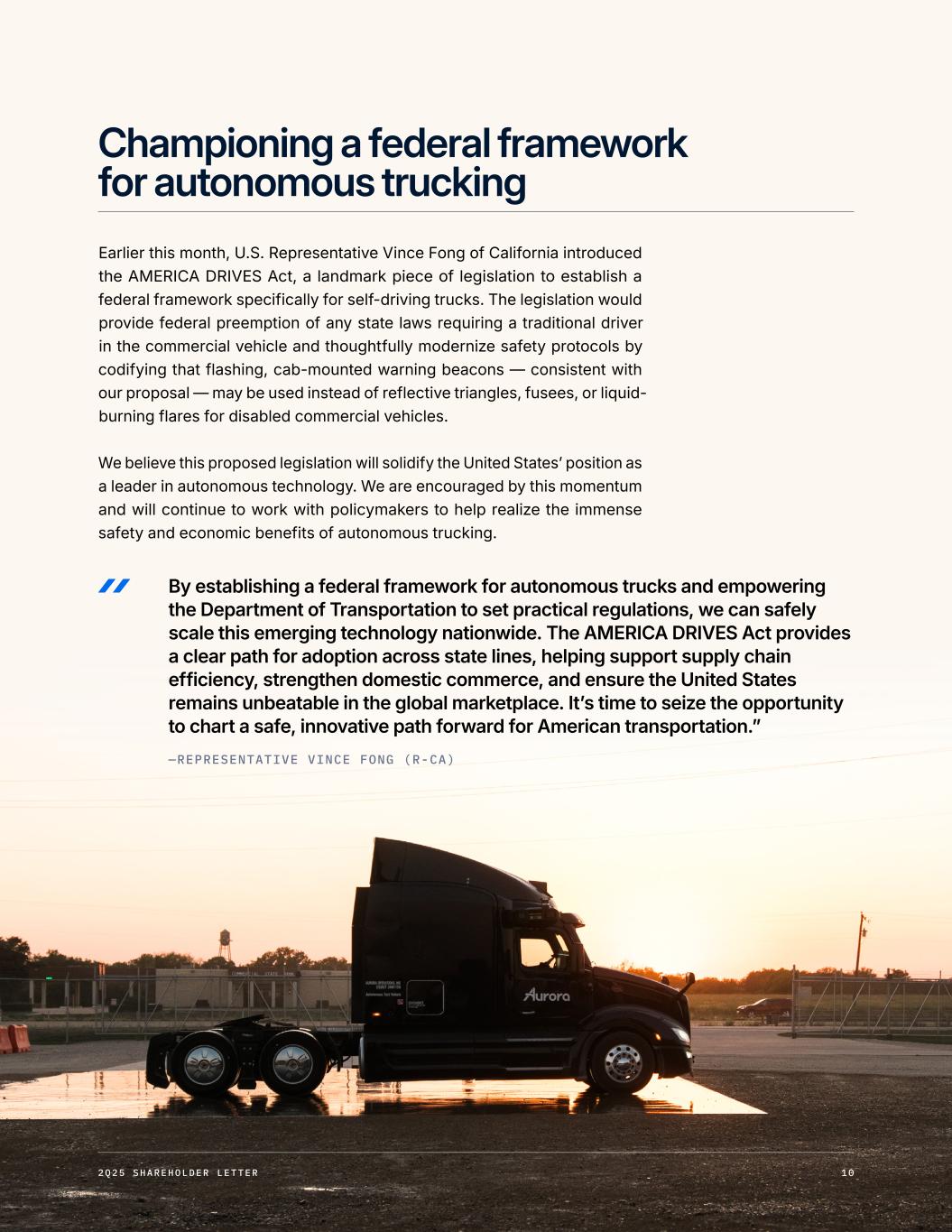 Championing a federal framework for autonomous trucking Earlier this month, U.S. Representative Vince Fong of California introduced the AMERICA DRIVES Act, a landmark piece of legislation to establish a federal framework specifically for self-driving trucks. The legislation would provide federal preemption of any state laws requiring a traditional driver in the commercial vehicle and thoughtfully modernize safety protocols by codifying that flashing, cab-mounted warning beacons — consistent with our proposal — may be used instead of reflective triangles, fusees, or liquid- burning flares for disabled commercial vehicles. We believe this proposed legislation will solidify the United States’ position as a leader in autonomous technology. We are encouraged by this momentum and will continue to work with policymakers to help realize the immense safety and economic benefits of autonomous trucking. By establishing a federal framework for autonomous trucks and empowering the Department of Transportation to set practical regulations, we can safely scale this emerging technology nationwide. The AMERICA DRIVES Act provides a clear path for adoption across state lines, helping support supply chain efficiency, strengthen domestic commerce, and ensure the United States remains unbeatable in the global marketplace. It’s time to seize the opportunity to chart a safe, innovative path forward for American transportation.” —REPRESENTATIVE VINCE FONG (R-CA) 102Q25 SHAREHOLDER LETTER