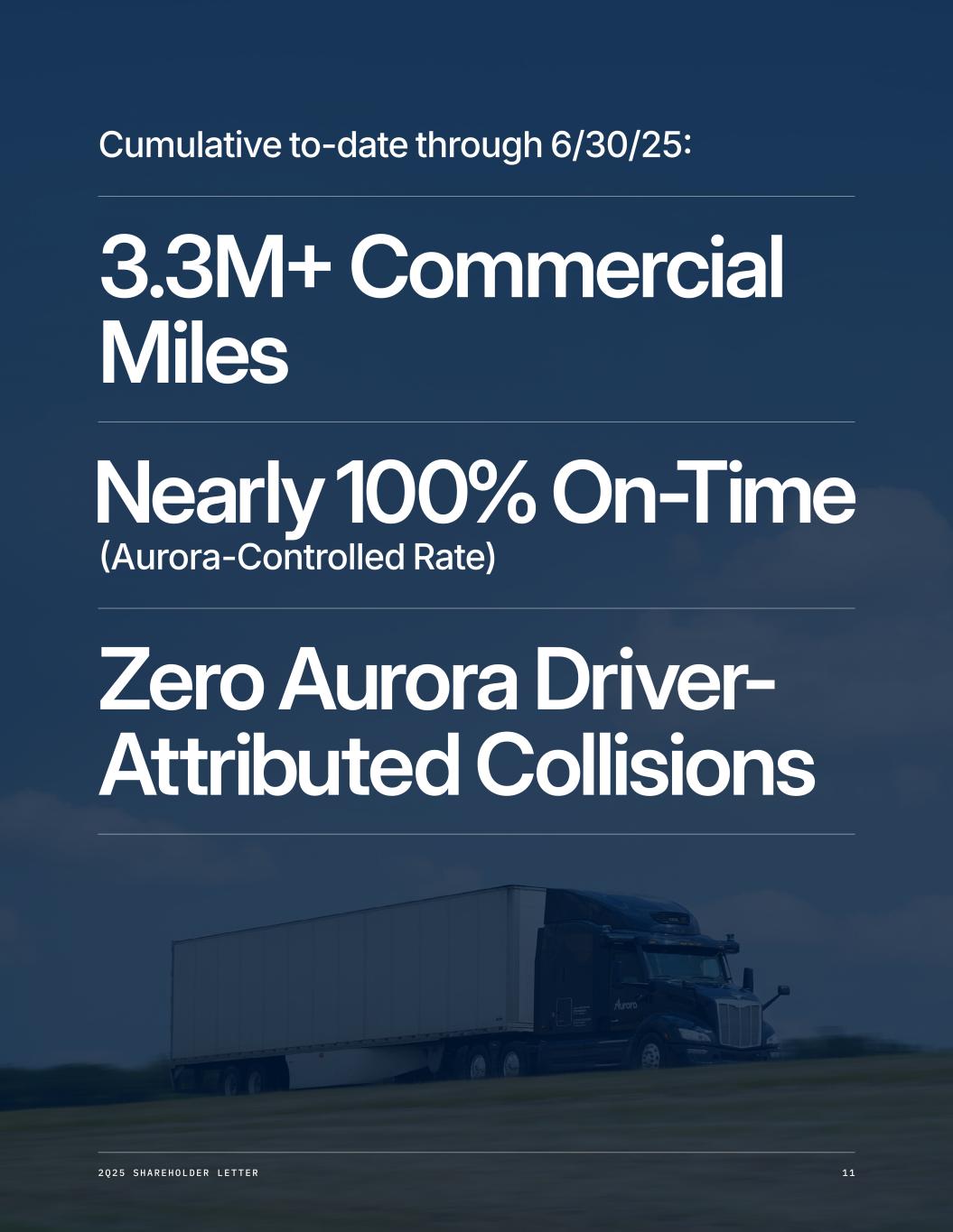 3.3M+ Commercial Miles Zero Aurora Driver- Attributed Collisions Nearly 100% On-Time Cumulative to-date through 6/30/25: (Aurora-Controlled Rate) 112Q25 SHAREHOLDER LETTER