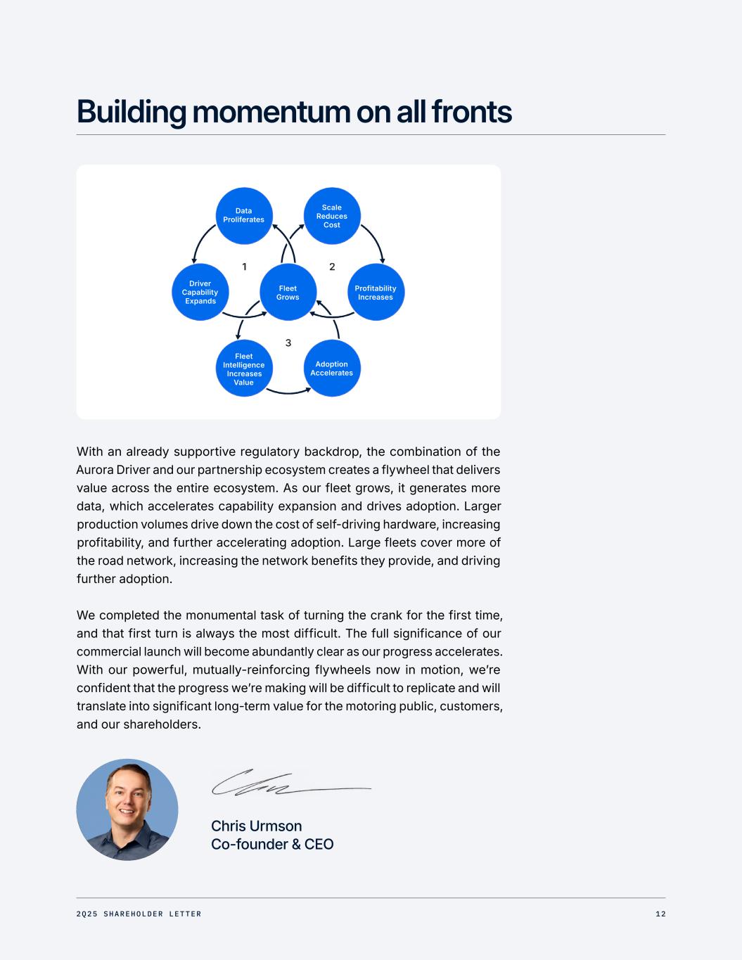 Data Proliferates Fleet Grows Profitability Increases Driver Capability Expands Fleet Intelligence Increases Value Adoption Accelerates Scale Reduces Cost Building momentum on all fronts With an already supportive regulatory backdrop, the combination of the Aurora Driver and our partnership ecosystem creates a flywheel that delivers value across the entire ecosystem. As our fleet grows, it generates more data, which accelerates capability expansion and drives adoption. Larger production volumes drive down the cost of self-driving hardware, increasing profitability, and further accelerating adoption. Large fleets cover more of the road network, increasing the network benefits they provide, and driving further adoption. We completed the monumental task of turning the crank for the first time, and that first turn is always the most difficult. The full significance of our commercial launch will become abundantly clear as our progress accelerates. With our powerful, mutually-reinforcing flywheels now in motion, we’re confident that the progress we’re making will be difficult to replicate and will translate into significant long-term value for the motoring public, customers, and our shareholders. Chris Urmson Co-founder & CEO 122Q25 SHAREHOLDER LETTER
