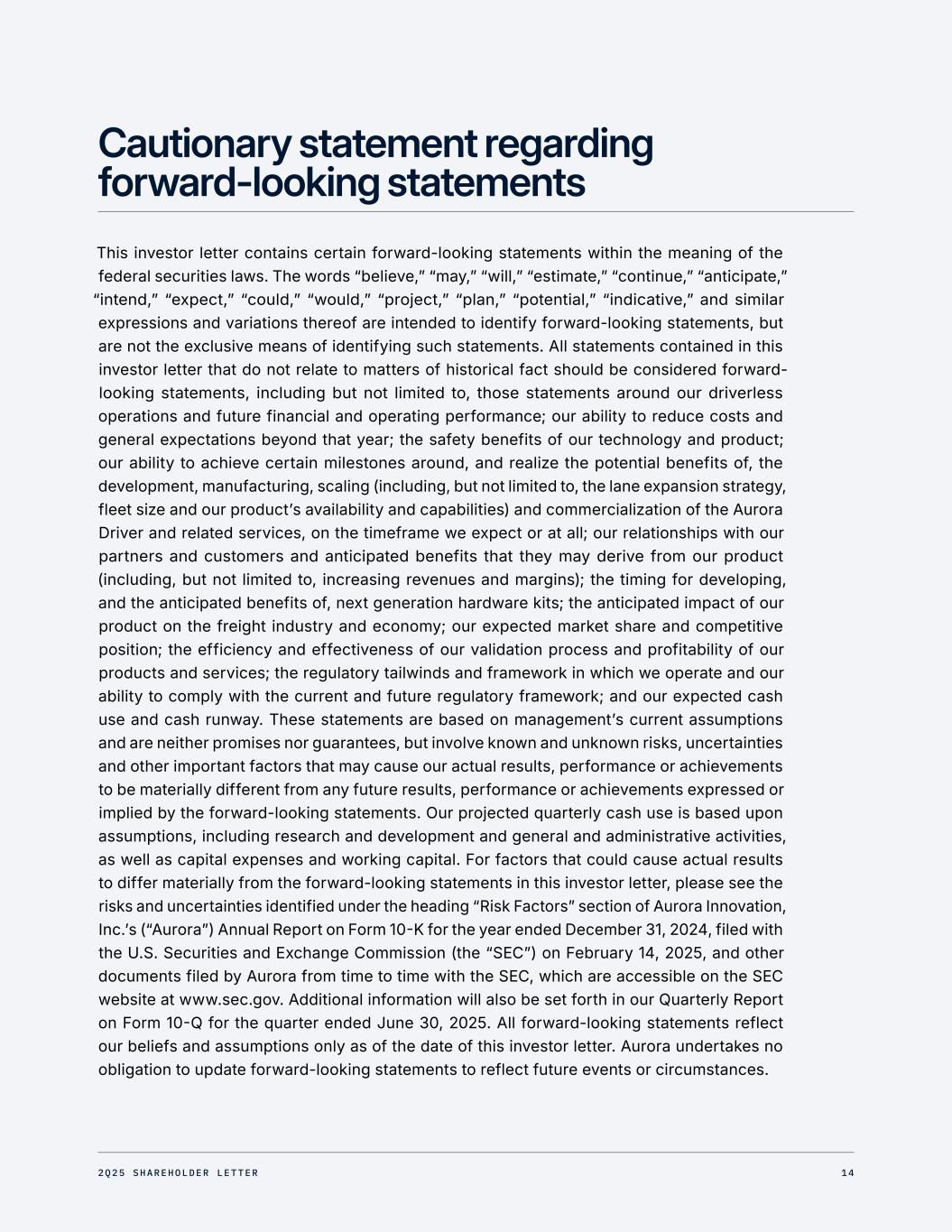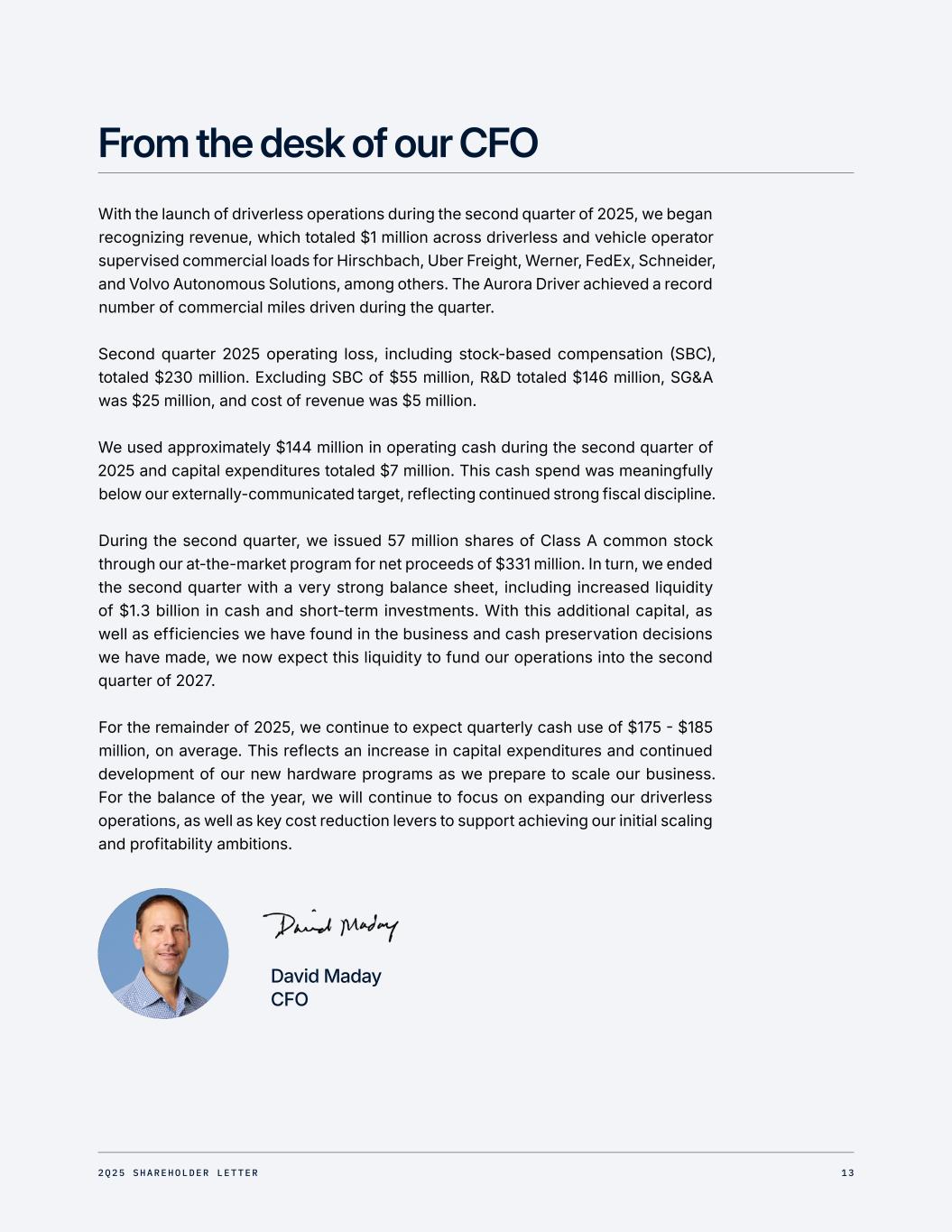 From the desk of our CFO David Maday CFO With the launch of driverless operations during the second quarter of 2025, we began recognizing revenue, which totaled $1 million across driverless and vehicle operator supervised commercial loads for Hirschbach, Uber Freight, Werner, FedEx, Schneider, and Volvo Autonomous Solutions, among others. The Aurora Driver achieved a record number of commercial miles driven during the quarter. Second quarter 2025 operating loss, including stock-based compensation (SBC), totaled $230 million. Excluding SBC of $55 million, R&D totaled $146 million, SG&A was $25 million, and cost of revenue was $5 million. We used approximately $144 million in operating cash during the second quarter of 2025 and capital expenditures totaled $7 million. This cash spend was meaningfully below our externally-communicated target, reflecting continued strong fiscal discipline. During the second quarter, we issued 57 million shares of Class A common stock through our at-the-market program for net proceeds of $331 million. In turn, we ended the second quarter with a very strong balance sheet, including increased liquidity of $1.3 billion in cash and short-term investments. With this additional capital, as well as efficiencies we have found in the business and cash preservation decisions we have made, we now expect this liquidity to fund our operations into the second quarter of 2027. For the remainder of 2025, we continue to expect quarterly cash use of $175 - $185 million, on average. This reflects an increase in capital expenditures and continued development of our new hardware programs as we prepare to scale our business. For the balance of the year, we will continue to focus on expanding our driverless operations, as well as key cost reduction levers to support achieving our initial scaling and profitability ambitions. 132Q25 SHAREHOLDER LETTER