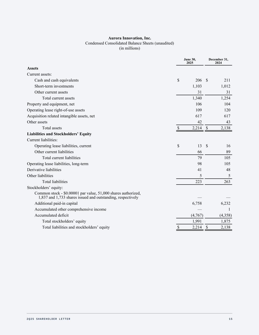 Aurora Innovation, Inc. Condensed Consolidated Balance Sheets (unaudited) (in millions) June 30, 2025 December 31, 2024 Assets Current assets: Cash and cash equivalents $ 206 $ 211 Short-term investments 1,103 1,012 Other current assets 31 31 Total current assets 1,340 1,254 Property and equipment, net 106 104 Operating lease right-of-use assets 109 120 Acquisition related intangible assets, net 617 617 Other assets 42 43 Total assets $ 2,214 $ 2,138 Liabilities and Stockholders’ Equity Current liabilities: Operating lease liabilities, current $ 13 $ 16 Other current liabilities 66 89 Total current liabilities 79 105 Operating lease liabilities, long-term 98 105 Derivative liabilities 41 48 Other liabilities 5 5 Total liabilities 223 263 Stockholders’ equity: Common stock - $0.00001 par value, 51,000 shares authorized, 1,837 and 1,733 shares issued and outstanding, respectively — — Additional paid-in capital 6,758 6,232 Accumulated other comprehensive income — 1 Accumulated deficit (4,767) (4,358) Total stockholders’ equity 1,991 1,875 Total liabilities and stockholders’ equity $ 2,214 $ 2,138 152Q25 SHAREHOLDER LETTER
