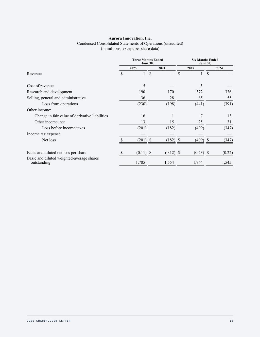 Aurora Innovation, Inc. Condensed Consolidated Statements of Operations (unaudited) (in millions, except per share data) Three Months Ended June 30, Six Months Ended June 30, 2025 2024 2025 2024 Revenue $ 1 $ — $ 1 $ — Cost of revenue 5 — 5 — Research and development 190 170 372 336 Selling, general and administrative 36 28 65 55 Loss from operations (230) (198) (441) (391) Other income: Change in fair value of derivative liabilities 16 1 7 13 Other income, net 13 15 25 31 Loss before income taxes (201) (182) (409) (347) Income tax expense — — — — Net loss $ (201) $ (182) $ (409) $ (347) Basic and diluted net loss per share $ (0.11) $ (0.12) $ (0.23) $ (0.22) Basic and diluted weighted-average shares outstanding 1,785 1,554 1,764 1,545 162Q25 SHAREHOLDER LETTER