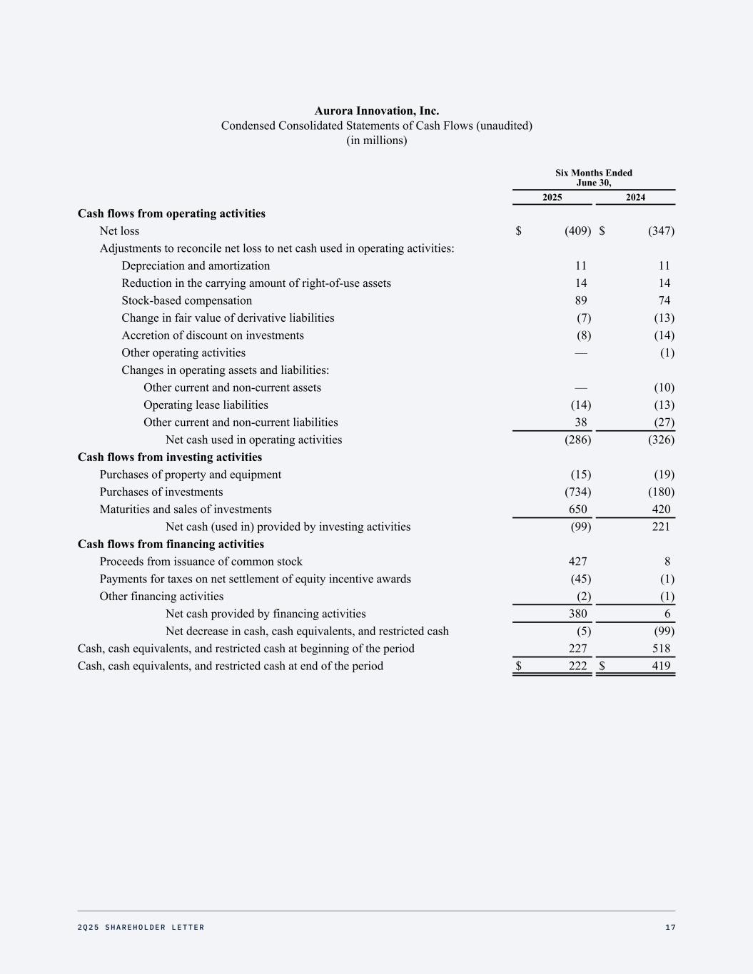 Aurora Innovation, Inc. Condensed Consolidated Statements of Cash Flows (unaudited) (in millions) Six Months Ended June 30, 2025 2024 Cash flows from operating activities Net loss $ (409) $ (347) Adjustments to reconcile net loss to net cash used in operating activities: Depreciation and amortization 11 11 Reduction in the carrying amount of right-of-use assets 14 14 Stock-based compensation 89 74 Change in fair value of derivative liabilities (7) (13) Accretion of discount on investments (8) (14) Other operating activities — (1) Changes in operating assets and liabilities: Other current and non-current assets — (10) Operating lease liabilities (14) (13) Other current and non-current liabilities 38 (27) Net cash used in operating activities (286) (326) Cash flows from investing activities Purchases of property and equipment (15) (19) Purchases of investments (734) (180) Maturities and sales of investments 650 420 Net cash (used in) provided by investing activities (99) 221 Cash flows from financing activities Proceeds from issuance of common stock 427 8 Payments for taxes on net settlement of equity incentive awards (45) (1) Other financing activities (2) (1) Net cash provided by financing activities 380 6 Net decrease in cash, cash equivalents, and restricted cash (5) (99) Cash, cash equivalents, and restricted cash at beginning of the period 227 518 Cash, cash equivalents, and restricted cash at end of the period $ 222 $ 419 172Q25 SHAREHOLDER LETTER