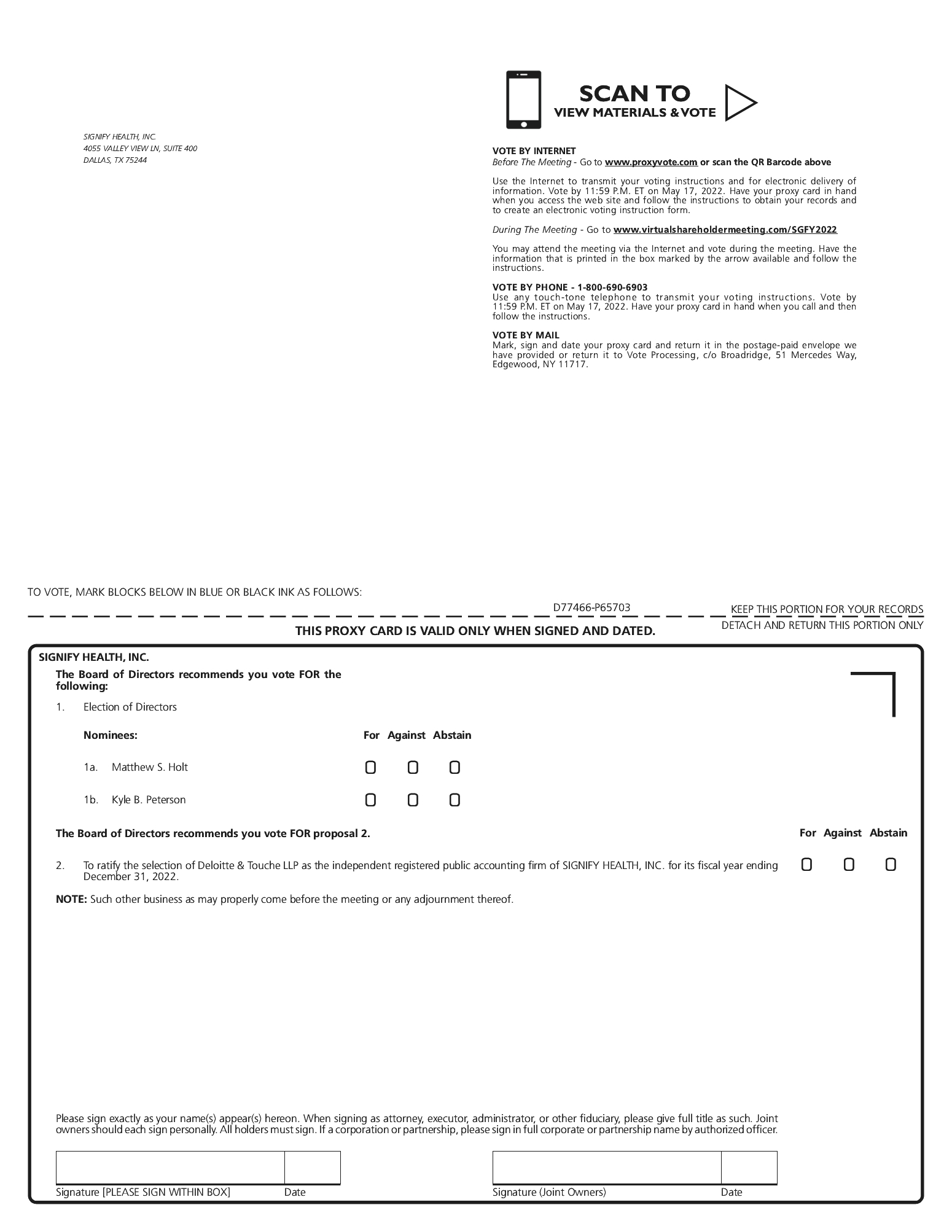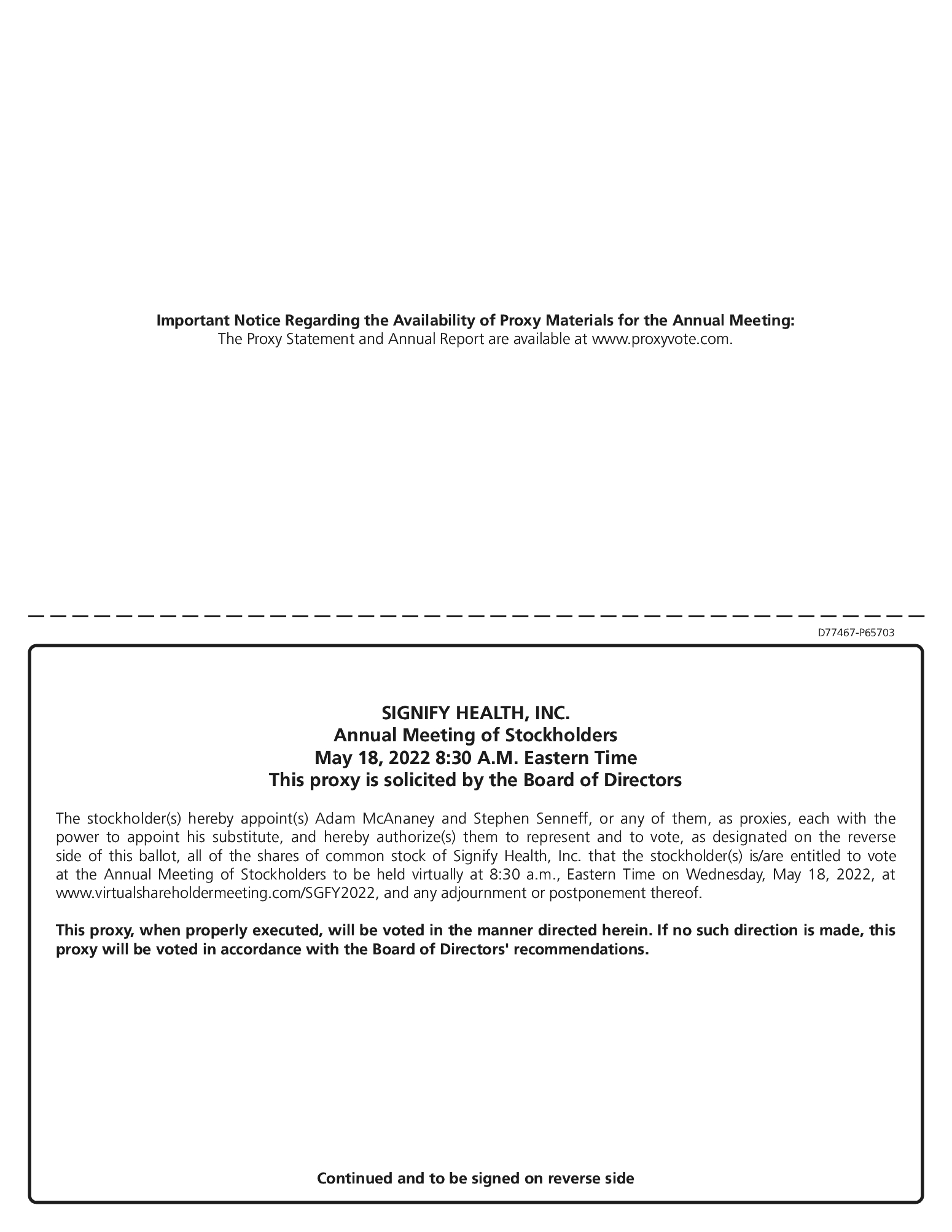 In connection with our IPO, the stock options outstanding under the New Remedy Corp. Amended and Restated 2019 Equity Incentive Plan, a plan assumed by us in connection with the acquisition of Remedy Partners Inc., were converted into stock options with respect to shares of our Class A common stock, with the number of shares and the exercise price adjusted on a proportionate basis. In addition, the plan was amended and restated (and renamed the Signify Health, Inc. Amended and Restated 2019 Equity Incentive Plan (the “2019 Plan”)) to provide for the issuance of shares of our Class A common stock upon the exercise of such stock options. Following our IPO, no further grants have been or will be made under the 2019 Plan.