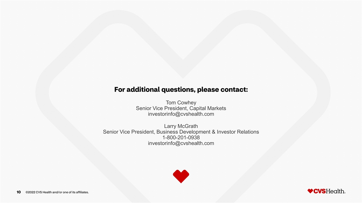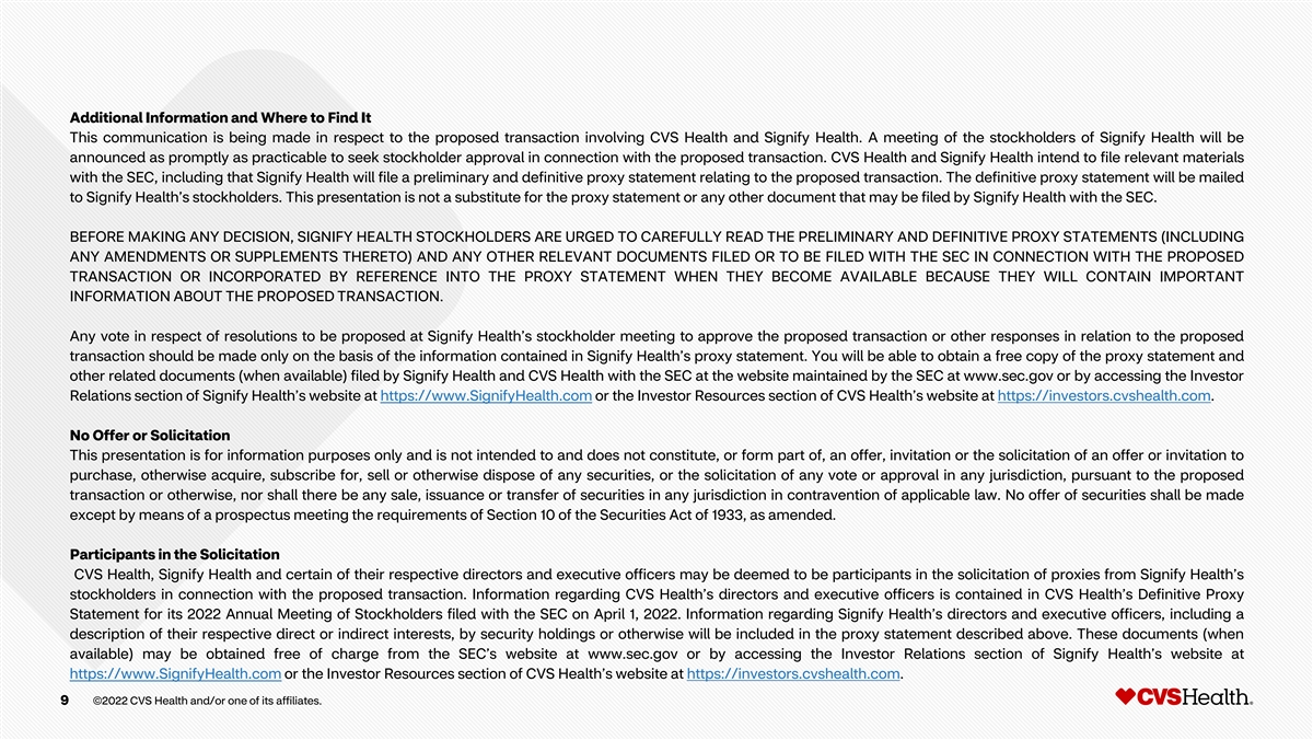 Additional Information and Where to Find It This communication is being made in respect to the proposed transaction involving CVS Health and Signify Health. A meeting of the stockholders of Signify Health will be announced as promptly as practicable to seek stockholder approval in connection with the proposed transaction. CVS Health and Signify Health intend to file relevant materials with the SEC, including that Signify Health will file a preliminary and definitive proxy statement relating to the proposed transaction. The definitive proxy statement will be mailed to Signify Health’s stockholders. This presentation is not a substitute for the proxy statement or any other document that may be filed by Signify Health with the SEC. BEFORE MAKING ANY DECISION, SIGNIFY HEALTH STOCKHOLDERS ARE URGED TO CAREFULLY READ THE PRELIMINARY AND DEFINITIVE PROXY STATEMENTS (INCLUDING ANY AMENDMENTS OR SUPPLEMENTS THERETO) AND ANY OTHER RELEVANT DOCUMENTS FILED OR TO BE FILED WITH THE SEC IN CONNECTION WITH THE PROPOSED TRANSACTION OR INCORPORATED BY REFERENCE INTO THE PROXY STATEMENT WHEN THEY BECOME AVAILABLE BECAUSE THEY WILL CONTAIN IMPORTANT INFORMATION ABOUT THE PROPOSED TRANSACTION. Any vote in respect of resolutions to be proposed at Signify Health’s stockholder meeting to approve the proposed transaction or other responses in relation to the proposed transaction should be made only on the basis of the information contained in Signify Health’s proxy statement. You will be able to obtain a free copy of the proxy statement and other related documents (when available) filed by Signify Health and CVS Health with the SEC at the website maintained by the SEC at www.sec.gov or by accessing the Investor Relations section of Signify Health’s website at https://www.SignifyHealth.com or the Investor Resources section of CVS Health’s website at https://investors.cvshealth.com. No Offer or Solicitation This presentation is for information purposes only and is not intended to and does not constitute, or form part of, an offer, invitation or the solicitation of an offer or invitation to purchase, otherwise acquire, subscribe for, sell or otherwise dispose of any securities, or the solicitation of any vote or approval in any jurisdiction, pursuant to the proposed transaction or otherwise, nor shall there be any sale, issuance or transfer of securities in any jurisdiction in contravention of applicable law. No offer of securities shall be made except by means of a prospectus meeting the requirements of Section 10 of the Securities Act of 1933, as amended. Participants in the Solicitation CVS Health, Signify Health and certain of their respective directors and executive officers may be deemed to be participants in the solicitation of proxies from Signify Health’s stockholders in connection with the proposed transaction. Information regarding CVS Health’s directors and executive officers is contained in CVS Health’s Definitive Proxy Statement for its 2022 Annual Meeting of Stockholders filed with the SEC on April 1, 2022. Information regarding Signify Health’s directors and executive officers, including a description of their respective direct or indirect interests, by security holdings or otherwise will be included in the proxy statement described above. These documents (when available) may be obtained free of charge from the SEC’s website at www.sec.gov or by accessing the Investor Relations section of Signify Health’s website at https://www.SignifyHealth.com or the Investor Resources section of CVS Health’s website at https://investors.cvshealth.com. 9 ©2022 CVS Health and/or one of its affiliates.