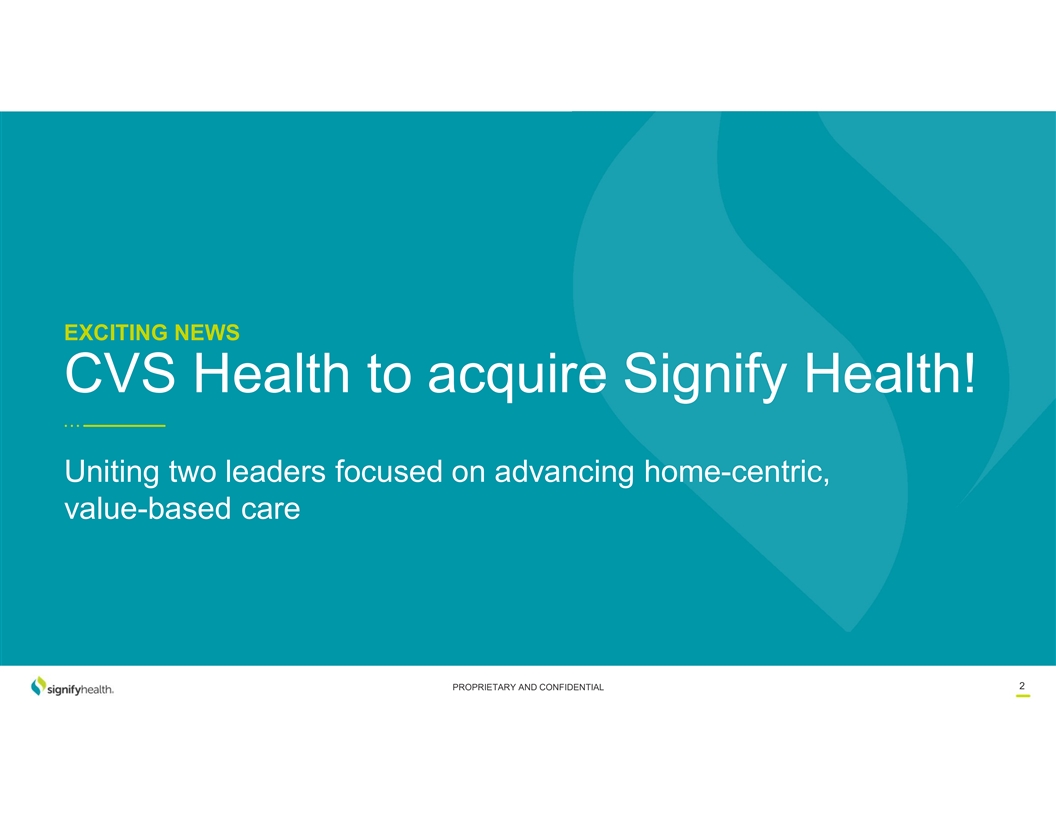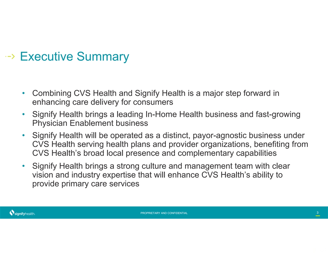 EXCITING NEWS CVS Health to acquire Signify Health! Uniting two leaders focused on advancing home-centric, value-based care 2 PROPRIETARY AND CONFIDENTIAL