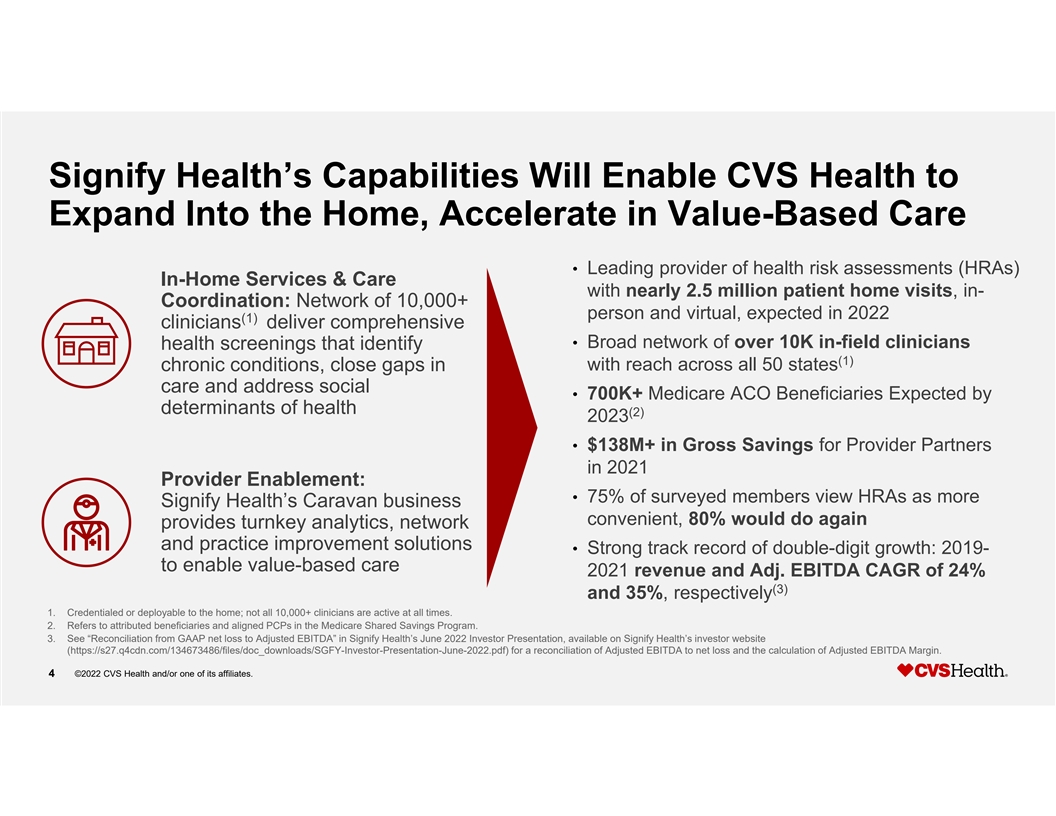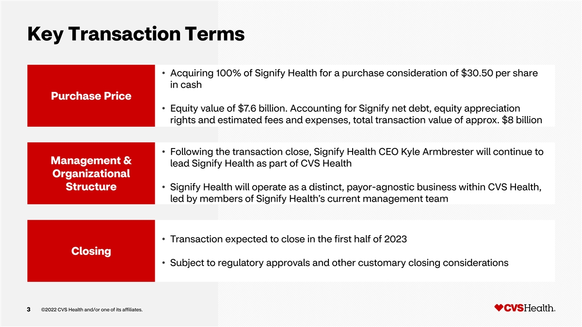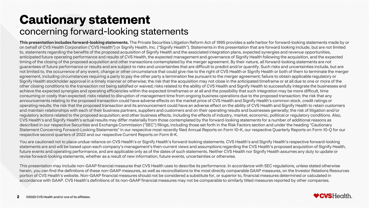 Cautionary statement concerning forward-looking statements This presentation includes forward-looking statements. The Private Securities Litigation Reform Act of 1995 provides a safe harbor for forward-looking statements made by or on behalf of CVS Health Corporation (“CVS Health”) or Signify Health, Inc. (“Signify Health”). Statements in this presentation that are forward looking include, but are not limited to, statements regarding the benefits of the proposed acquisition of Signify Health and the associated integration plans, expected synergies and revenue opportunities, anticipated future operating performance and results of CVS Health, the expected management and governance of Signify Health following the acquisition, and the expected timing of the closing of the proposed acquisition and other transactions contemplated by the merger agreement. By their nature, all forward-looking statements are not guarantees of future performance or results and are subject to risks and uncertainties that are difficult to predict and/or quantify. Such risks and uncertainties include, but are not limited to, the occurrence of any event, change or other circumstance that could give rise to the right of CVS Health or Signify Health or both of them to terminate the merger agreement, including circumstances requiring a party to pay the other party a termination fee pursuant to the merger agreement; failure to obtain applicable regulatory or Signify Health stockholder approval in a timely manner or otherwise; the risk that the acquisition may not close in the anticipated timeframe or at all due to one or more of the other closing conditions to the transaction not being satisfied or waived; risks related to the ability of CVS Health and Signify Health to successfully integrate the businesses and achieve the expected synergies and operating efficiencies within the expected timeframes or at all and the possibility that such integration may be more difficult, time consuming or costly than expected; risks related to disruption of management time from ongoing business operations due to the proposed transaction; the risk that any announcements relating to the proposed transaction could have adverse effects on the market price of CVS Health and Signify Health’s common stock, credit ratings or operating results; the risk that the proposed transaction and its announcement could have an adverse effect on the ability of CVS Health and Signify Health to retain customers and maintain relationships with each of their business partners, suppliers and customers and on their operating results and businesses generally; the risk of litigation and/or regulatory actions related to the proposed acquisition; and other business effects, including the effects of industry, market, economic, political or regulatory conditions. Also, CVS Health’s and Signify Health’s actual results may differ materially from those contemplated by the forward-looking statements for a number of additional reasons as described in our respective Securities and Exchange Commission (“SEC”) filings, including those set forth in the Risk Factors section and under the heading “Cautionary Statement Concerning Forward-Looking Statements” in our respective most recently filed Annual Reports on Form 10-K, our respective Quarterly Reports on Form 10-Q for our respective second quarters of 2022 and our respective Current Reports on Form 8-K. You are cautioned not to place undue reliance on CVS Health’s or Signify Health’s forward-looking statements. CVS Health’s and Signify Health’s respective forward-looking statements are and will be based upon each company’s management’s then-current views and assumptions regarding the CVS Health’s proposed acquisition of Signify Health, future events and operating performance, and are applicable only as of the dates of such statements. Neither CVS Health nor Signify Health assumes any duty to update or revise forward-looking statements, whether as a result of new information, future events, uncertainties or otherwise. This presentation may include non-GAAP financial measures that CVS Health uses to describe its performance. In accordance with SEC regulations, unless stated otherwise herein, you can find the definitions of these non-GAAP measures, as well as reconciliations to the most directly comparable GAAP measures, on the Investor Relations Resources portion of CVS Health’s website. Non-GAAP financial measures should not be considered a substitute for, or superior to, financial measures determined or calculated in accordance with GAAP. CVS Health’s definitions of its non-GAAP financial measures may not be comparable to similarly titled measures reported by other companies. 2 ©2022 CVS Health and/or one of its affiliates.
