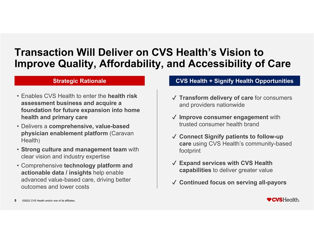 Executive Summary Combining CVS Health and Signify Health is a major step forward in enhancing our care delivery strategy for consumers Signify Health brings a leading In-Home Health business and fast-growing Physician Enablement business The transaction is expected to be accretive to Adjusted EPS and significantly increases our confidence in delivering on our 2024 financial targets Signify Health will be operated as a distinct, payor-agnostic business under CVS Health serving health plans and provider organizations, benefiting from CVS Health’s broad local presence and complementary capabilities Signify Health brings a strong culture and management team with clear vision and industry expertise that will enhance CVS Health’s ability to provide primary care services 4 4 ©2022 CVS Health and/or one of its affiliates.