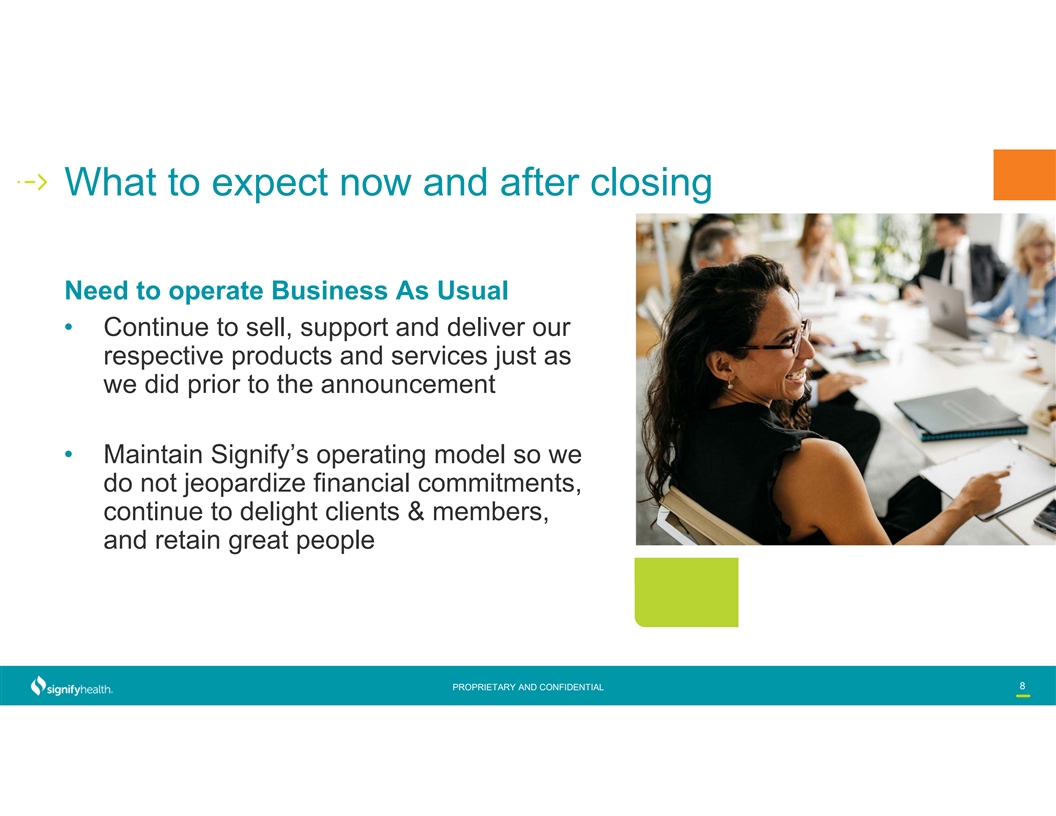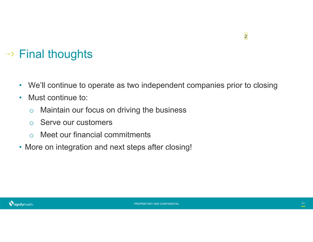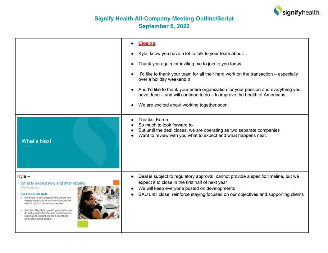 Signify Health All-Company Meeting Outline/Script September 6, 2022 ● Closing: ● Kyle, know you have a lot to talk to your team about… ● Thank you again for inviting me to join to you today. ● I’d like to thank your team for all their hard work on the transaction – especially over a holiday weekend. ● And I’d like to thank your entire organization for your passion and everything you have done – and will continue to do – to improve the health of Americans. ● We are excited about working together soon. ● Thanks, Karen ● So much to look forward to ● But until the deal closes, we are operating as two separate companies ● Want to review with you what to expect and what happens next. Kyle – ● Deal is subject to regulatory approval; cannot provide a specific timeline, but we expect it to close in the first half of next year ● We will keep everyone posted on developments ● BAU until close; reinforce staying focused on our objectives and supporting clients