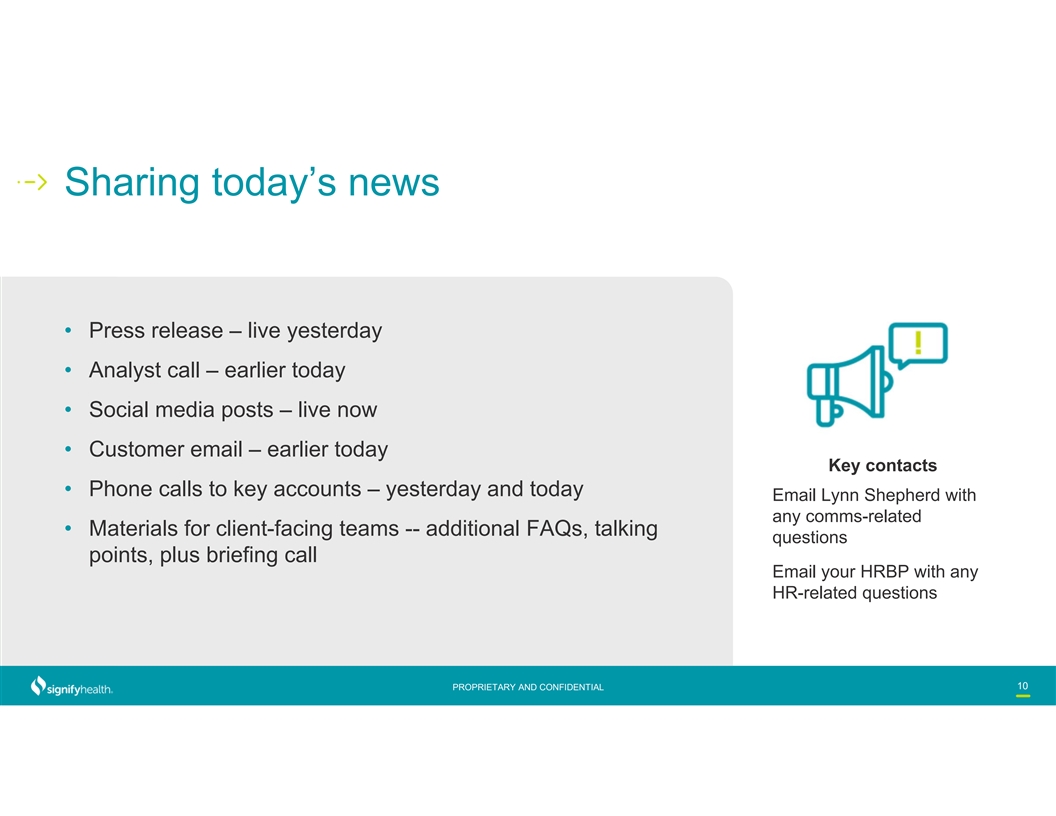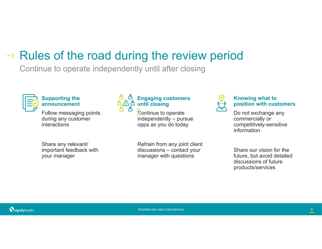 What to expect now and after closing Need to operate Business As Usual • Continue to sell, support and deliver our respective products and services just as we did prior to the announcement • Maintain Signify’s operating model so we do not jeopardize financial commitments, continue to delight clients & members, and retain great people 8 PROPRIETARY AND CONFIDENTIAL
