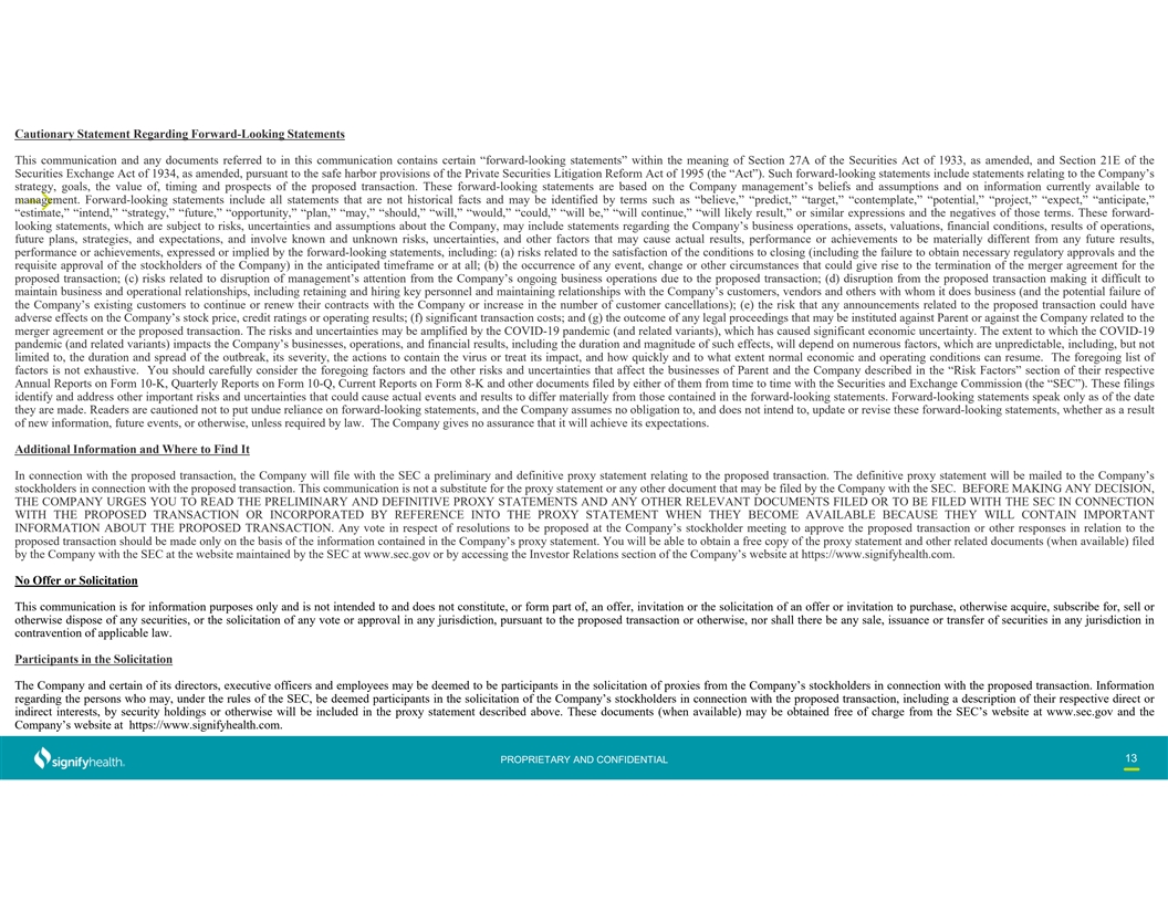 CautionaryStatementRegardingForward-LookingStatements Thiscommunicationandanydocumentsreferredtointhiscommunicationcontainscertain“forward-lookingstatements”withinthemeaningofSection27AoftheSecuritiesActof1933,asamended,andSection21Eofthe SecuritiesExchangeActof1934,asamended,pursuanttothesafeharborprovisionsofthePrivateSecuritiesLitigationReformActof1995(the“Act”).Suchforward-lookingstatementsincludestatementsrelatingtotheCompany’s strategy,goals,thevalueof,timingandprospectsoftheproposedtransaction.Theseforward-lookingstatementsarebasedontheCompanymanagement’sbeliefsandassumptionsandoninformationcurrentlyavailableto management.Forward-lookingstatementsincludeallstatementsthatarenothistoricalfactsandmaybeidentifiedbytermssuchas“believe,”“predict,”“target,”“contemplate,”“potential,”“project,”“expect,”“anticipate,” “estimate,”“intend,”“strategy,”“future,”“opportunity,”“plan,”“may,”“should,”“will,”“would,”“could,”“willbe,”“willcontinue,”“willlikelyresult,”orsimilarexpressionsandthenegativesofthoseterms.Theseforward- lookingstatements,whicharesubjecttorisks,uncertaintiesandassumptionsabouttheCompany,mayincludestatementsregardingtheCompany’sbusinessoperations,assets,valuations,financialconditions,resultsofoperations, futureplans,strategies,andexpectations,andinvolveknownandunknownrisks,uncertainties,andotherfactorsthatmaycauseactualresults,performanceorachievementstobemateriallydifferentfromanyfutureresults, performanceorachievements,expressedorimpliedbytheforward-lookingstatements,including:(a)risksrelatedtothesatisfactionoftheconditionstoclosing(includingthefailuretoobtainnecessaryregulatoryapprovalsandthe requisiteapprovalofthestockholdersoftheCompany)intheanticipatedtimeframeoratall;(b)theoccurrenceofanyevent,changeorothercircumstancesthatcouldgiverisetotheterminationofthemergeragreementforthe proposedtransaction;(c)risksrelatedtodisruptionofmanagement’sattentionfromtheCompany’songoingbusinessoperationsduetotheproposedtransaction;(d)disruptionfromtheproposedtransactionmakingitdifficultto maintainbusinessandoperationalrelationships,includingretainingandhiringkeypersonnelandmaintainingrelationshipswiththeCompany’scustomers,vendorsandotherswithwhomitdoesbusiness(andthepotentialfailureof theCompany’sexistingcustomerstocontinueorrenewtheircontractswiththeCompanyorincreaseinthenumberofcustomercancellations);(e)theriskthatanyannouncementsrelatedtotheproposedtransactioncouldhave adverseeffectsontheCompany’sstockprice,creditratingsoroperatingresults;(f)significanttransactioncosts;and(g)theoutcomeofanylegalproceedingsthatmaybeinstitutedagainstParentoragainsttheCompanyrelatedtothe mergeragreementortheproposedtransaction.TherisksanduncertaintiesmaybeamplifiedbytheCOVID-19pandemic(andrelatedvariants),whichhascausedsignificanteconomicuncertainty.TheextenttowhichtheCOVID-19 pandemic(andrelatedvariants)impactstheCompany’sbusinesses,operations,andfinancialresults,includingthedurationandmagnitudeofsucheffects,willdependonnumerousfactors,whichareunpredictable,including,butnot limitedto,thedurationandspreadoftheoutbreak,itsseverity,theactionstocontainthevirusortreatitsimpact,andhowquicklyandtowhatextentnormaleconomicandoperatingconditionscanresume.Theforegoinglistof factorsisnotexhaustive.YoushouldcarefullyconsidertheforegoingfactorsandtheotherrisksanduncertaintiesthataffectthebusinessesofParentandtheCompanydescribedinthe“RiskFactors”sectionoftheirrespective AnnualReportsonForm10-K,QuarterlyReportsonForm10-Q,CurrentReportsonForm8-KandotherdocumentsfiledbyeitherofthemfromtimetotimewiththeSecuritiesandExchangeCommission(the“SEC”).Thesefilings identifyandaddressotherimportantrisksanduncertaintiesthatcouldcauseactualeventsandresultstodiffermateriallyfromthosecontainedintheforward-lookingstatements.Forward-lookingstatementsspeakonlyasofthedate theyaremade.Readersarecautionednottoputunduerelianceonforward-lookingstatements,andtheCompanyassumesnoobligationto,anddoesnotintendto,updateorrevisetheseforward-lookingstatements,whetherasaresult ofnewinformation,futureevents,orotherwise,unlessrequiredbylaw.TheCompanygivesnoassurancethatitwillachieveitsexpectations. AdditionalInformationandWheretoFindIt Inconnectionwiththeproposedtransaction,theCompanywillfilewiththeSECapreliminaryanddefinitiveproxystatementrelatingtotheproposedtransaction.ThedefinitiveproxystatementwillbemailedtotheCompan y’s stockholdersinconnectionwiththeproposedtransaction.ThiscommunicationisnotasubstitutefortheproxystatementoranyotherdocumentthatmaybefiledbytheCompanywiththeSEC.BEFOREMAKINGANYDECISION, THECOMPANYURGESYOUTOREADTHEPRELIMINARYANDDEFINITIVEPROXYSTATEMENTSANDANYOTHERRELEVANTDOCUMENTSFILEDORTOBEFILEDWITHTHESECINCONNECTION WITHTHEPROPOSEDTRANSACTIONORINCORPORATEDBYREFERENCEINTOTHEPROXYSTATEMENTWHENTHEYBECOMEAVAILABLEBECAUSETHEYWILLCONTAINIMPORTANT INFORMATIONABOUTTHEPROPOSEDTRANSACTION.AnyvoteinrespectofresolutionstobeproposedattheCompany’sstockholdermeetingtoapprovetheproposedtransactionorotherresponsesinrelationtothe proposedtransactionshouldbemadeonlyonthebasisoftheinformationcontainedintheCompany’sproxystatement.Youwillbeabletoobtainafreecopyoftheproxystatementandotherrelateddocuments(whenavailable)filed bytheCompanywiththeSECatthewebsitemaintainedbytheSECatwww.sec.govorbyaccessingtheInvestorRelationssectionoftheCompany’swebsiteathttps://www.signifyhealth.com. NoOfferorSolicitation Thiscommunicationisforinformationpurposesonlyandisnotintendedtoanddoesnotconstitute,orformpartof,anoffer,invitationorthesolicitationofanofferorinvitationtopurchase,otherwiseacquire,subscribefor,sellor otherwisedisposeofanysecurities,orthesolicitationofanyvoteorapprovalinanyjurisdiction,pursuanttotheproposedtransactionorotherwise,norshalltherebeanysale,issuanceortransferofsecuritiesinanyjurisdictionin contraventionofapplicablelaw. ParticipantsintheSolicitation TheCompanyandcertainofitsdirectors,executiveofficersandemployeesmaybedeeme