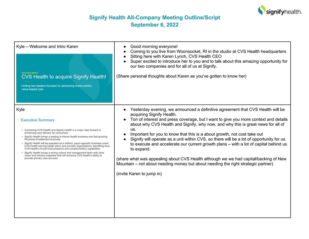 Signify Health All-Company Meeting Outline/Script September 6, 2022 Kyle – Welcome and Intro Karen ● Good morning everyone! ● Coming to you live from Woonsocket, RI in the studio at CVS Health headquarters ● Sitting here with Karen Lynch, CVS Health CEO ● Super excited to introduce her to you and to talk about this amazing opportunity for our two companies and for all of us at Signify. (Share personal thoughts about Karen as you’ve gotten to know her) Kyle ● Yesterday evening, we announced a definitive agreement that CVS Health will be acquiring Signify Health. ● Ton of interest and press coverage, but I want to give you more context and details about why CVS Health and Signify, why now, and why this is great news for all of us. ● Important for you to know that this is a about growth, not cost take out ● Signify will operate as a unit within CVS, so there will be a lot of opportunity for us to execute and accelerate our current growth plans – with a lot of capital behind us to expand. (share what was appealing about CVS Health although we we had capital/backing of New Mountain – not about needing money but about needing the right strategic partner) (invite Karen to jump in)